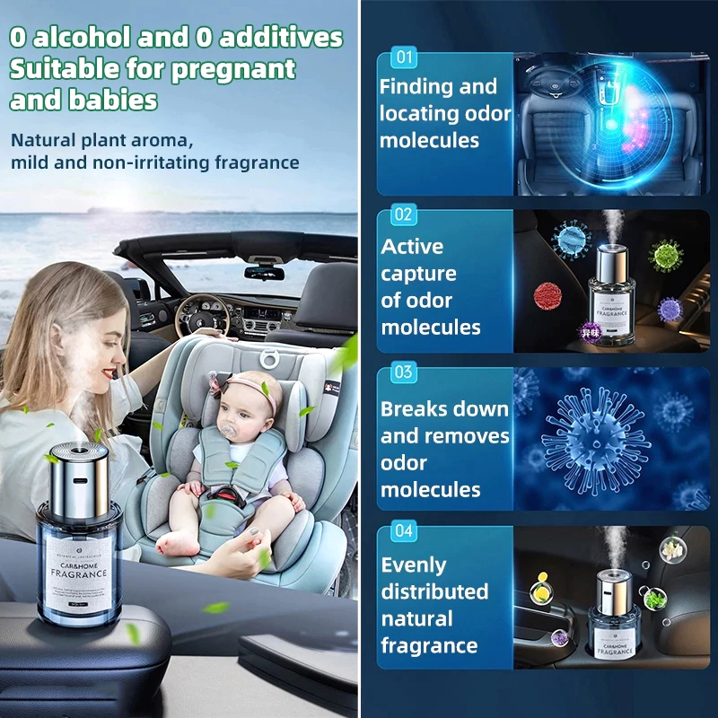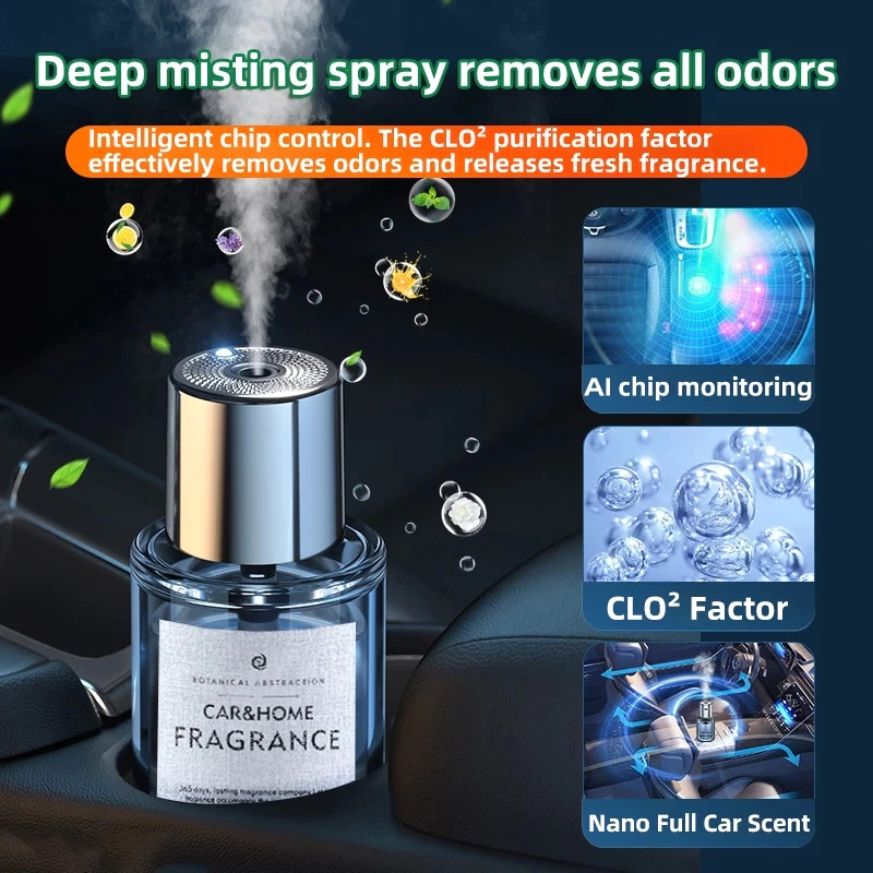 Menggunakan teknologi getaran ultrasonik untuk mengubah cairan parfum menjadi partikel nano yang sangat halus. Hasilnya, aroma dapat tersebar merata ke seluruh kabin mobil hanya dalam 1 detik.