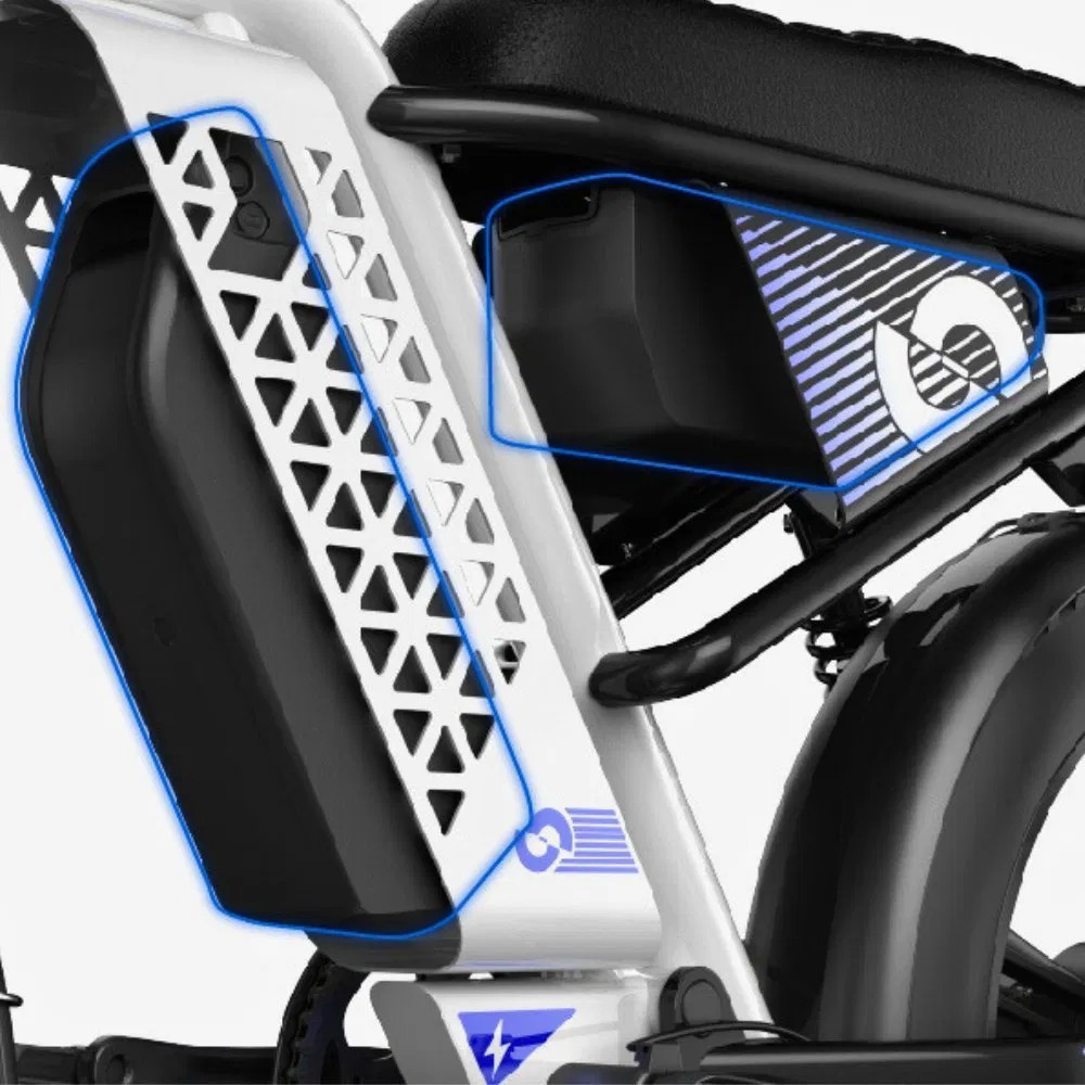 | Baterai Lithium Berdaya Tinggi Menggunakan baterai lithium 48 V 15 Ah berkualitas tinggi, sepeda listrik ini mampu menempuh jarak 60-80 km dengan pedal assist (PAS) dalam sekali pengisian. Desain baterai removable memudahkan proses pengisian daya di mana saja, sekaligus meningkatkan keamanan saat parkir atau penyimpanan. |