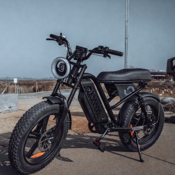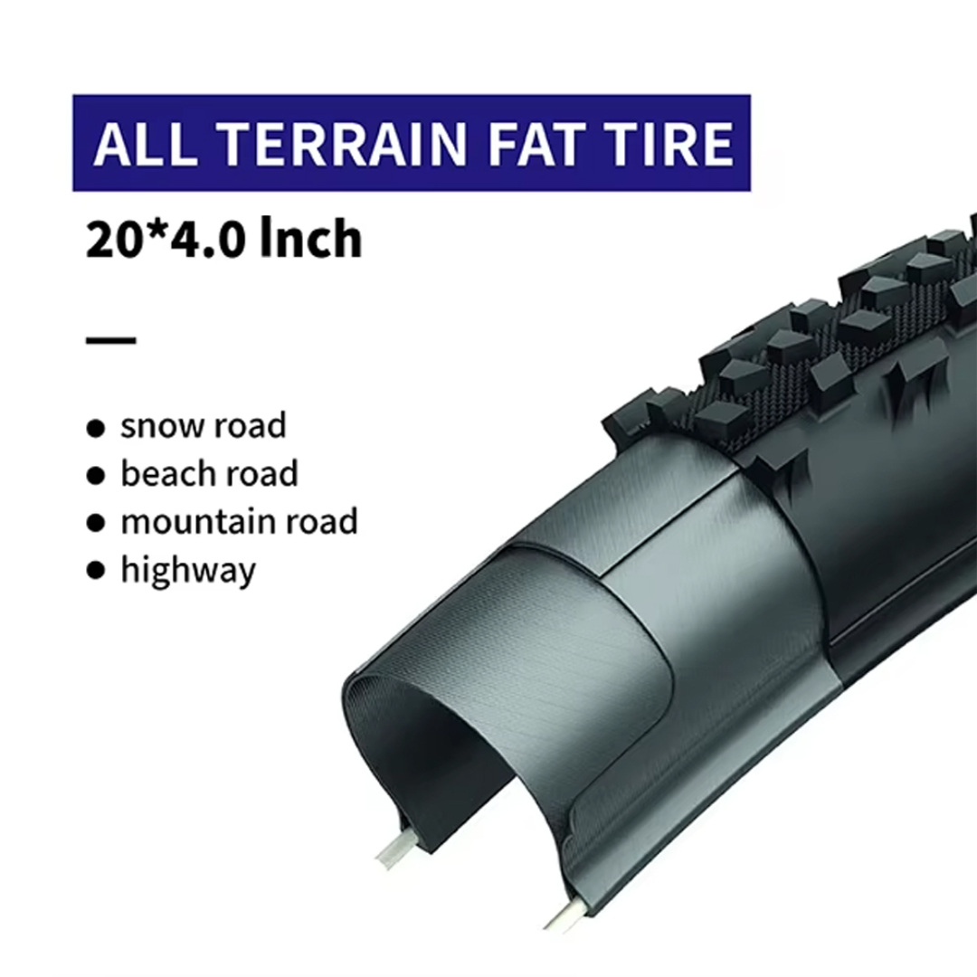 | Ban Besar Dukung Suspensi Menggunakan ban berukuran 20 x 4 Inch, sepeda listrik ini memberikan daya cengkeram yang lebih baik di berbagai medan, baik aspal maupun off-road. Kombinasi ban besar dengan fork suspensi depan juga meningkatkan kenyamanan saat melintasi jalanan yang tidak rata. |