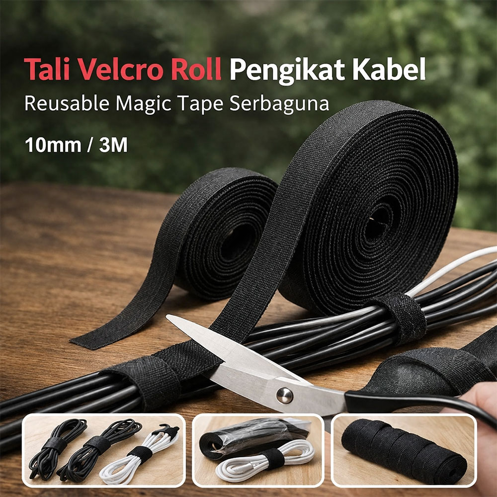 Produk ini hadir dalam dua pilihan yang dapat disesuaikan dengan kebutuhan. Varian 10mm x 3 Meter ideal untuk kabel tipis seperti kabel charger, kabel data, dan earphone yang membutuhkan ikatan ringan namun tetap rapi. Varian 12mm x 5 Meter cocok untuk bundel kabel yang lebih tebal, kabel listrik, atau tanaman rambat berukuran besar yang memerlukan ikatan lebih kuat dan lebar.