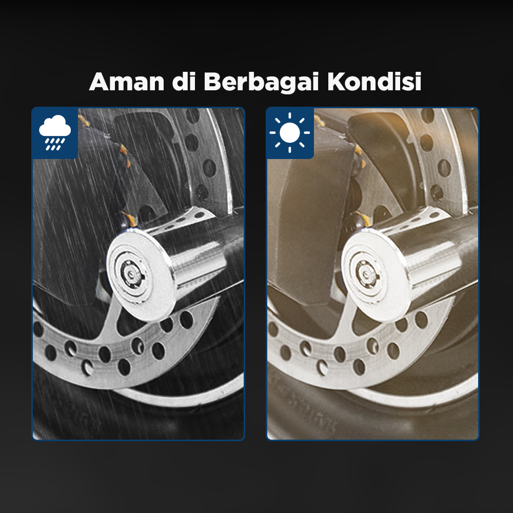 | Lindungi Berbagai Kendaraan Hadir dengan ukuran universal, gunakan gembok cakram untuk mengamankan berbagai kendaraan saat parkir. Mulai dari sepeda, skuter, hingga motor, semua tetap aman meski diparkir di mana saja. |