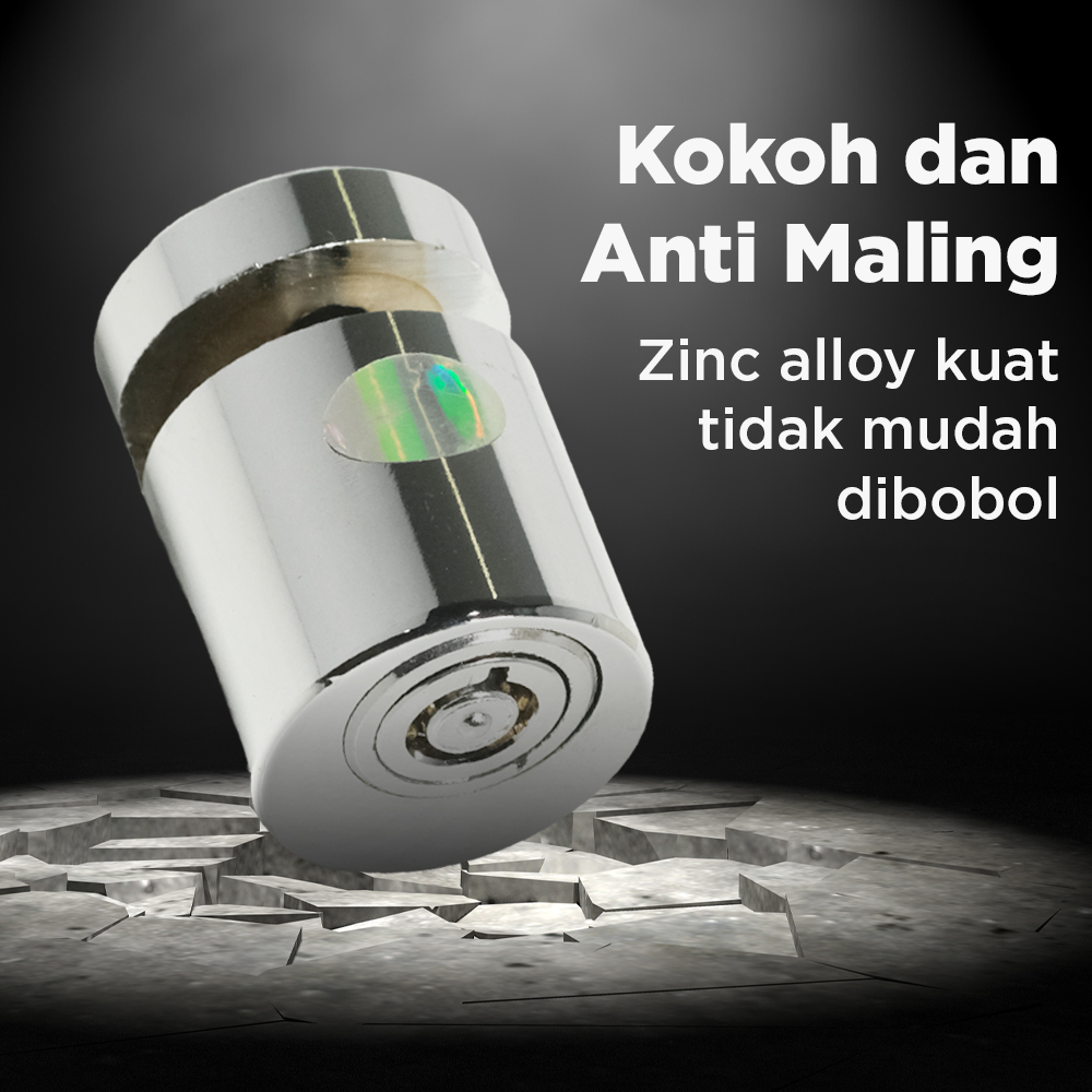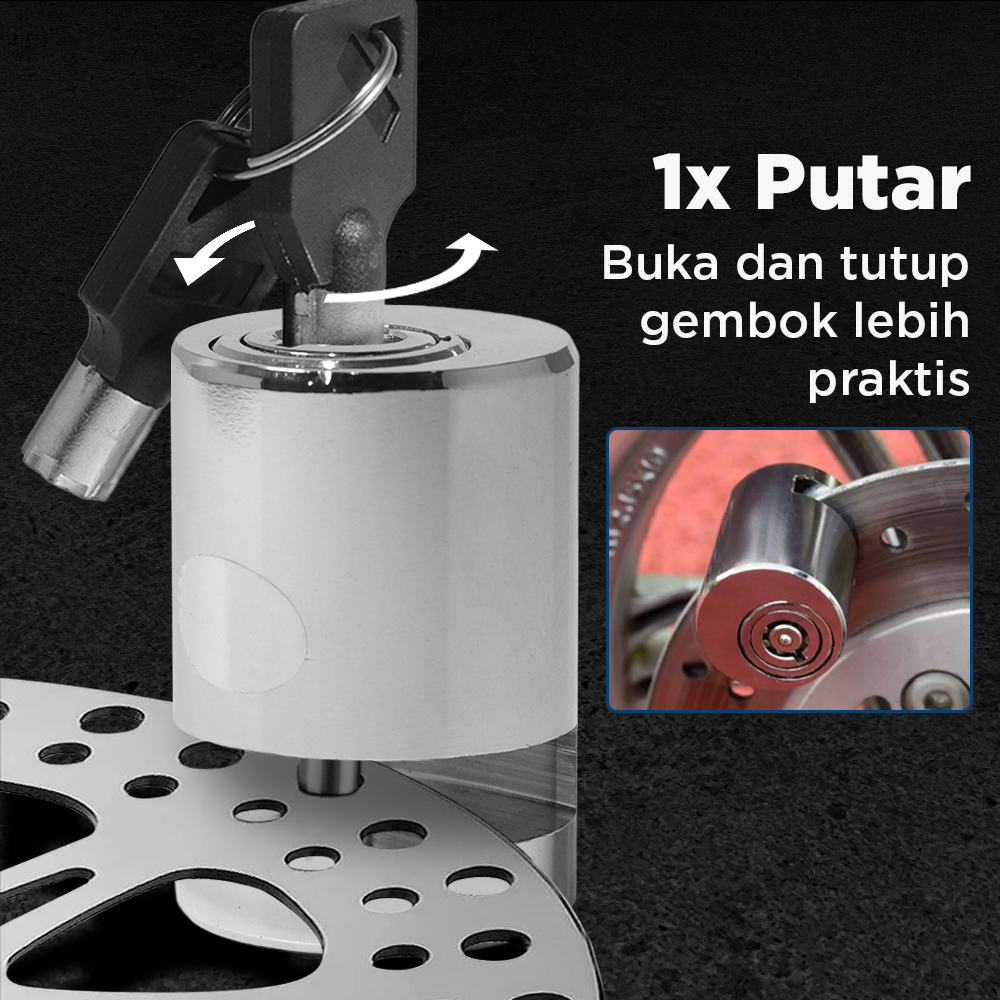 | Cukup 1x Putar Dibuat untuk Anda yang serba praktis, gembok cakram ini menggunakan kunci manual yang mudah. Cukup 1 x putar untuk membuka dan menutup gembok tanpa repot menghafal password. |