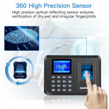 | Identifikasi Sidik Jari yang Cepat Mesin absen Taffware dilengkapi dengan teknologi sidik jari terkini, memastikan identifikasi yang cepat dan akurat. Setiap karyawan dapat dengan mudah melakukan absensi hanya dengan menyentuh sensor sidik jari, mengurangi risiko kesalahan dan manipulasi presensi. Sensor yang digunakan juga sangat sensitif sehingga bisa mengidentifikasi sidik jari dengan mudah meski jari sedang berkeringat. |