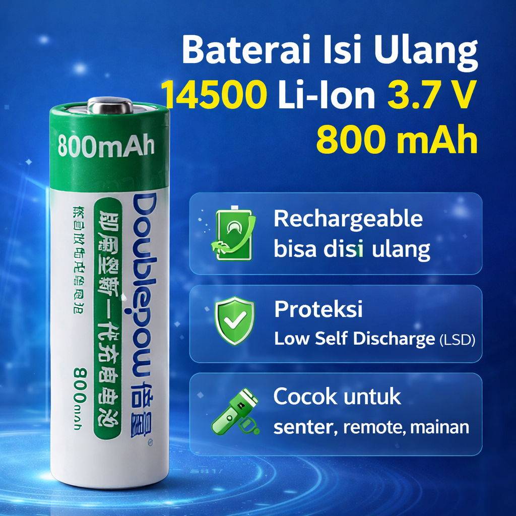 Sering repot membeli baterai sekali pakai yang cepat habis dan boros biaya? Saatnya beralih ke baterai rechargeable 14500 yang lebih hemat, tahan lama, dan bisa dipakai berulang kali. Doublepow Baterai 14500 Li-Ion 800 mAh 3.7 V hadir untuk perangkat elektronik Anda dengan performa stabil dan desain aman. Cocok digunakan untuk senter, alat elektronik portabel, hingga kebutuhan harian lainnya.