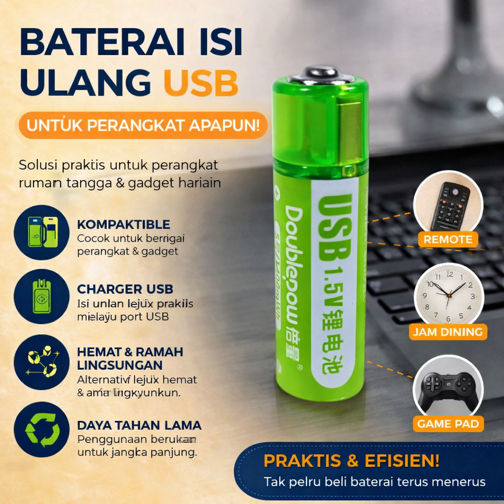 Sering boros karena harus beli baterai sekali pakai terus-menerus? Saatnya beralih ke baterai AA isi ulang dari Doublepow yang lebih hemat dan praktis. Dengan kapasitas 1400 mWh serta tegangan stabil 1.5 V, baterai isi ulang ini berbahan Li-Ion ini cocok untuk berbagai perangkat rumah tangga maupun gadget harian. Tinggal isi ulang via USB, pakai kembali kapan saja tanpa repot beli baterai baru.