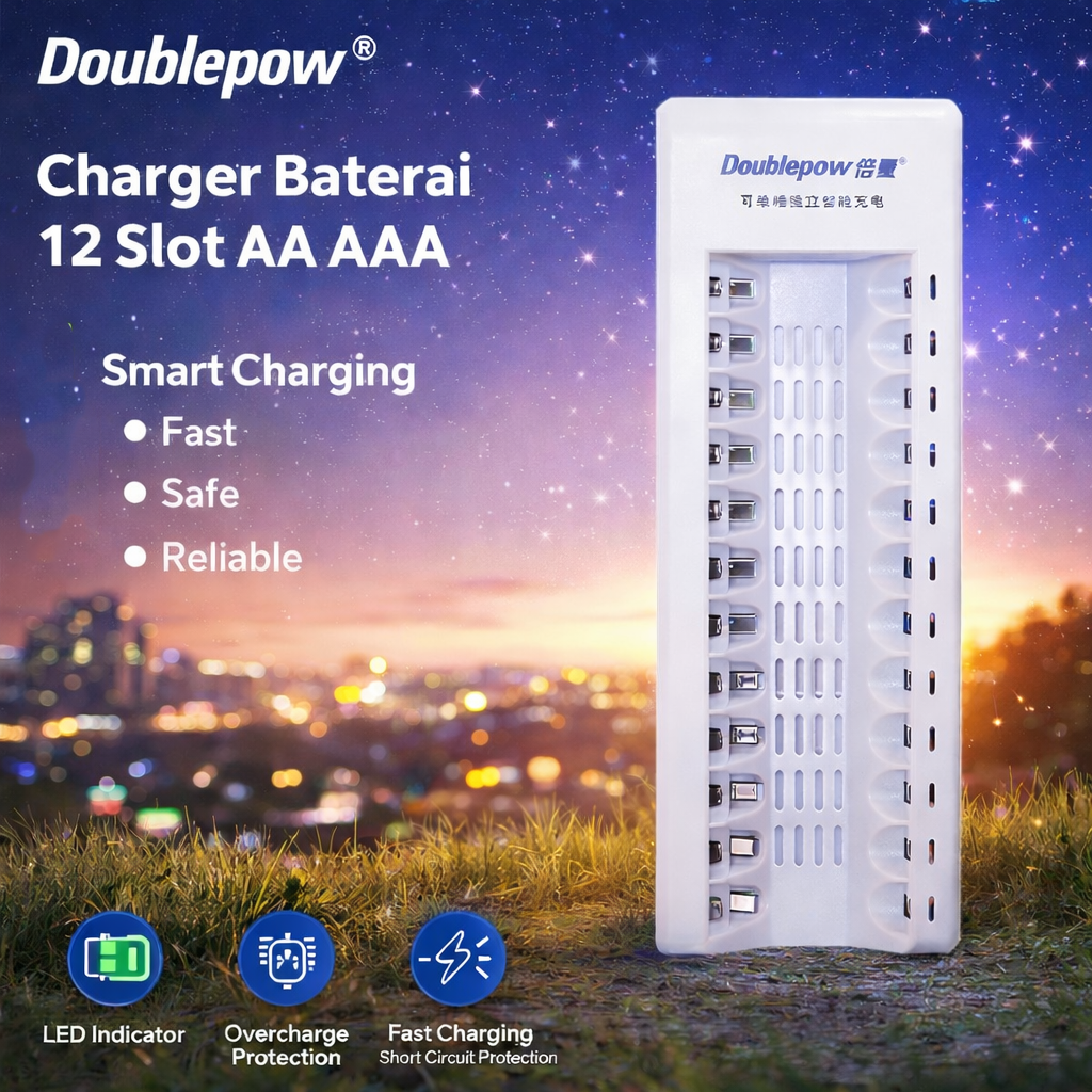 Butuh charger yang bisa mengisi daya banyak baterai sekaligus? Charger baterai 12 slot dari Doublepow adalah pilihan yang tepat untuk Anda! Dengan 12 slot, Anda dapat mengisi 12 baterai secara bersamaan. Kompatibel untuk mengisi ulang baterai jenis AA dan AAA. Dilengkapi dengan lampu indikator LED untuk melakukan pemantauan saat mengisi ulang daya baterai.
