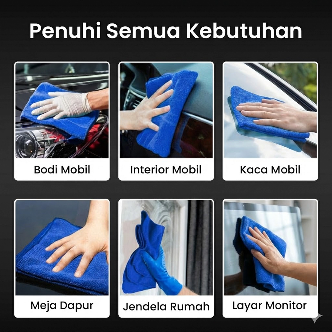 | Serbaguna untuk Berbagai Kebutuhan Satu kain untuk berbagai kebutuhan. Cocok untuk mengeringkan kendaraan, membersihkan debu, hingga mengelap kaca dan meja. Praktis dan efisien untuk penggunaan sehari-hari. |