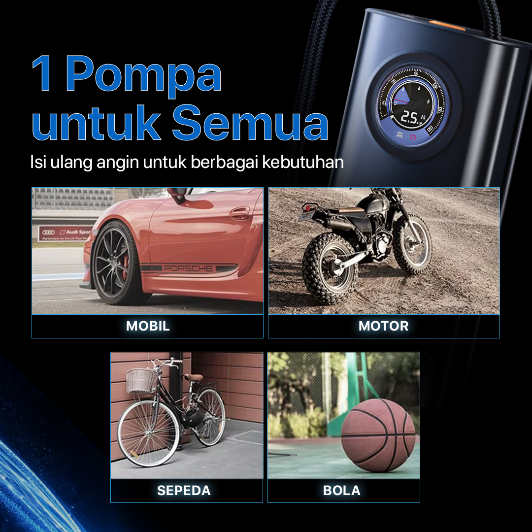 | Pilihan Adapter Praktis Dilengkapi 3 adapter, gunakan untuk mengisi ulang angin pada ban mobil, motor, sepeda, hingga bola dengan praktis. Tak perlu repot memeriksa dan mengatur tekanan manual. |