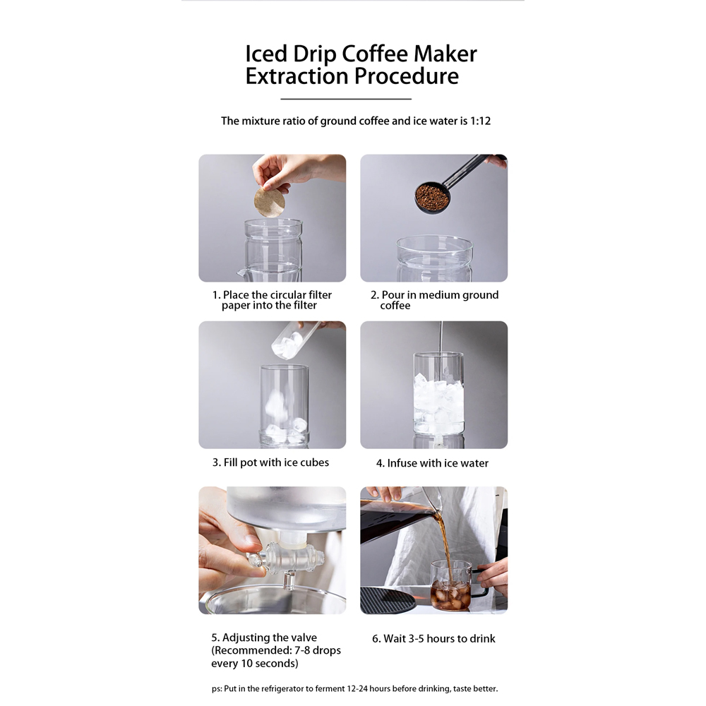 | Bersih dan Aroma Terjaga Dilengkapi penutup anti debu yang menjaga kebersihan selama proses ice drip berlangsung. Penutup ini mencegah kontaminasi dari lingkungan sekitar serta membantu mempertahankan aroma kopi agar tidak tercampur bau lain, terutama saat proses ekstraksi dilakukan di dalam kulkas. |