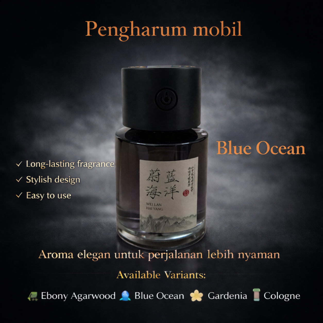 Diffuser ini sudah dilengkapi essential oil dengan kapasitas 140 ml. Terdapat pilihan aroma seperti Cologne, Gardenia, Blue Ocean, dan Ebony Agarwood. Anda dapat memilih aroma sesuai suasana hati maupun perjalanan yang ingin dinikmati.