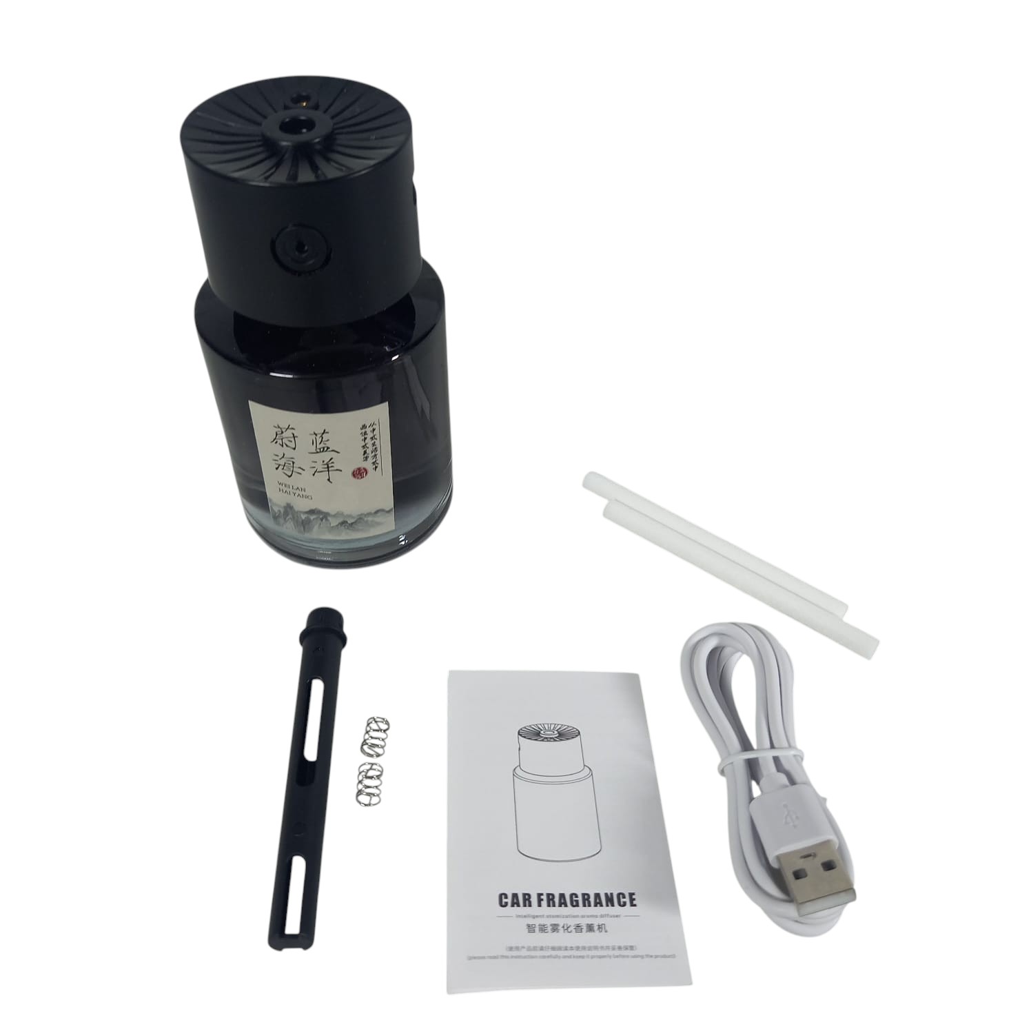 Botol Pengharum Mobil: - Tinggi: 11.5 cm - Diameter: 6 cm Panjang Kabel USB Type C: Sekitar 1 M Filter: - Panjang:8.5 cm - Diameter: 0.5 cm