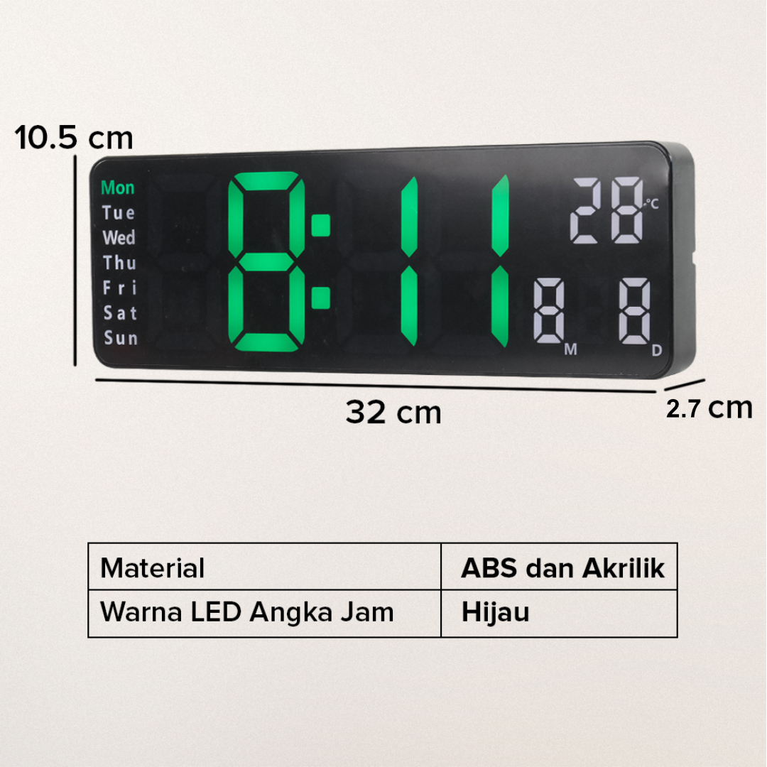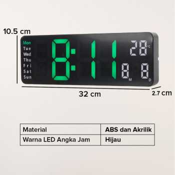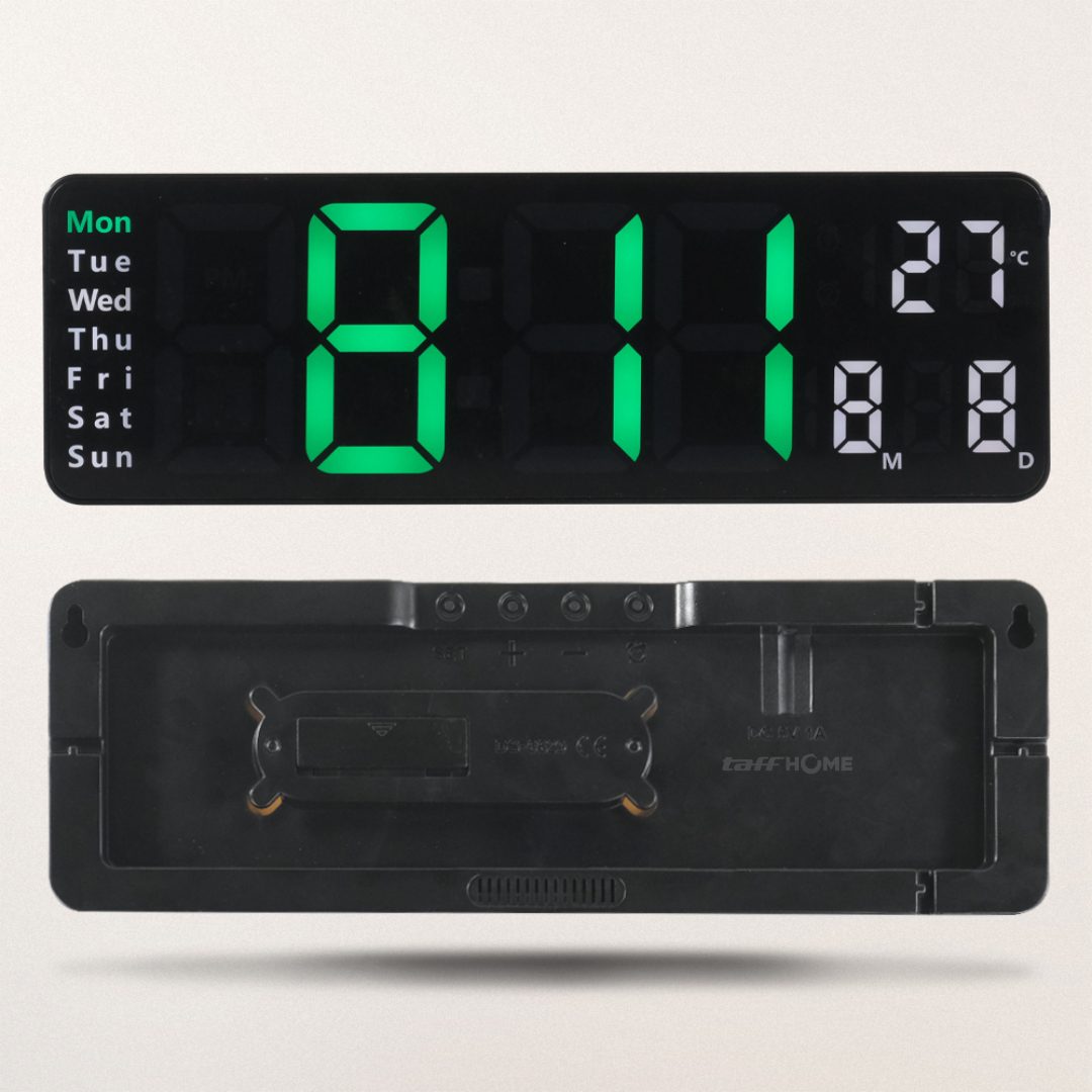 Jam dinding dari TaffHOME memiliki fungsi tak hanya menunjukkan waktu saja, tapi beragam fungsi lain mulai dari alarm, tanggal, timer, countdown, hingga temperatur. Hadir dengan layar digital dengan tampilan angka berwarna hijau. Lengkap dengan remot sehingga pengaturan akan lebih mudah untuk dilakukan. Tampilannya elegan dan minimalis, cocok juga digunakan sebagai dekorasi ruangan Anda yang mengusung tema minimalis.