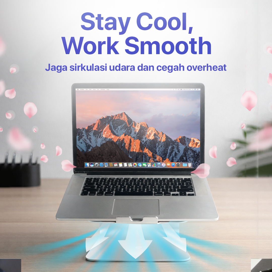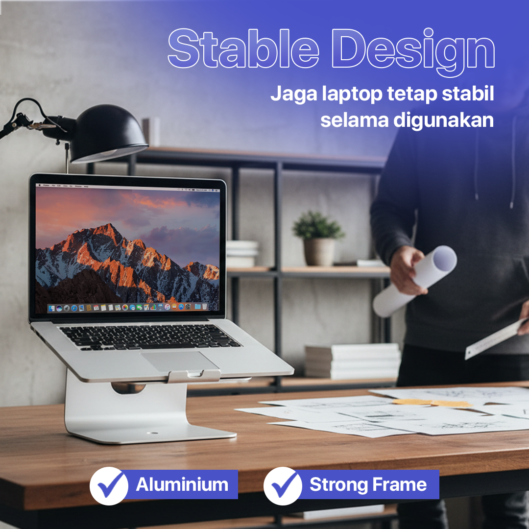 | Ergonomis dan Stabil Desain ergonomis dengan kemiringan yang pas dan material aluminium dapat menopang laptop dengan maksimal. Ini yang memastikan stand laptop tetap stabil. |