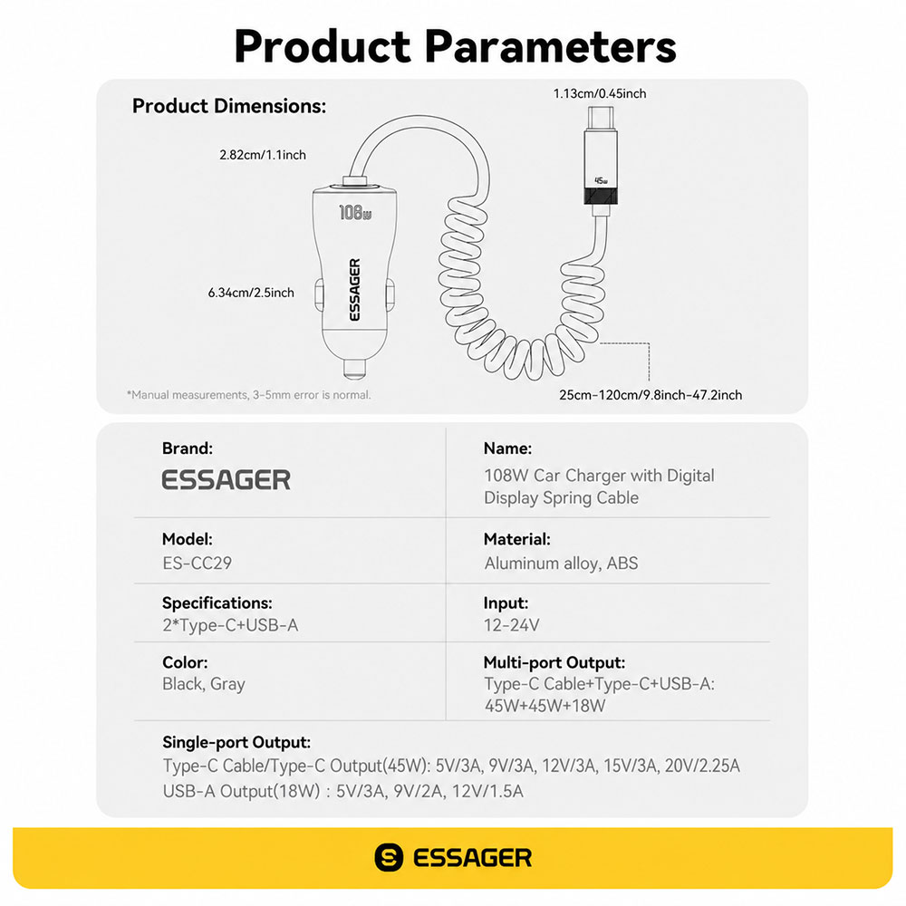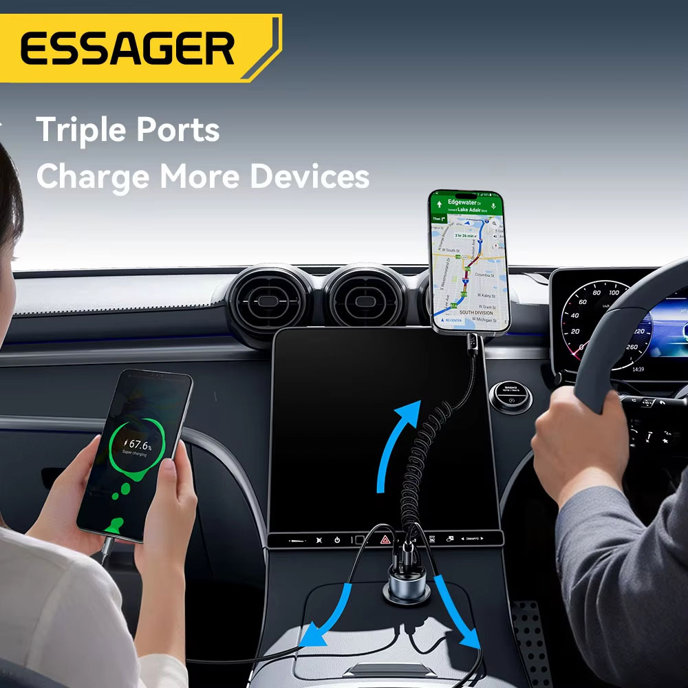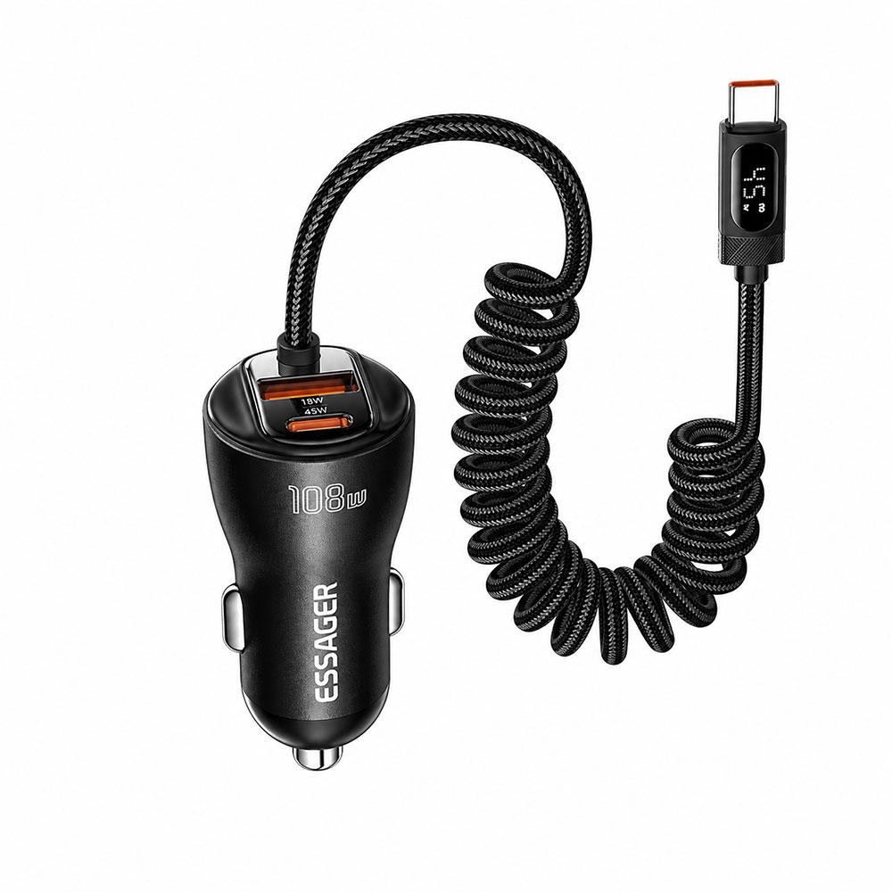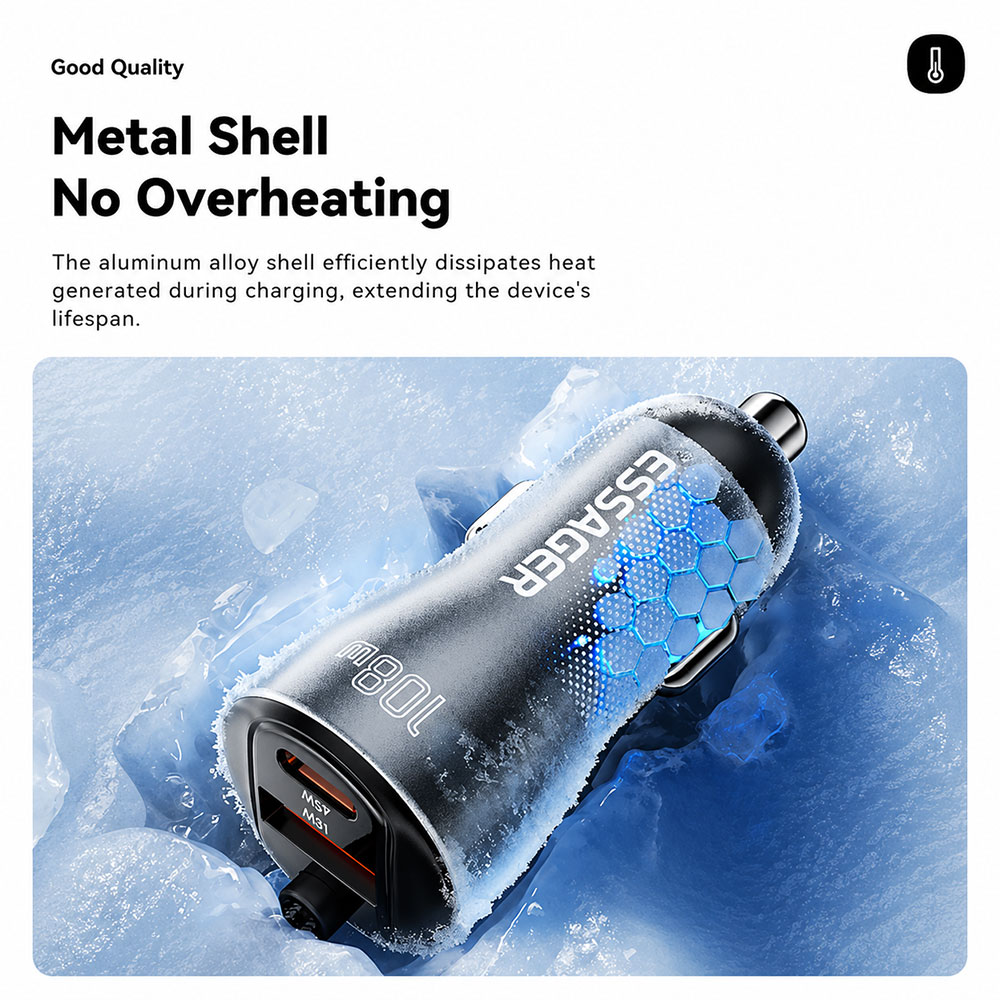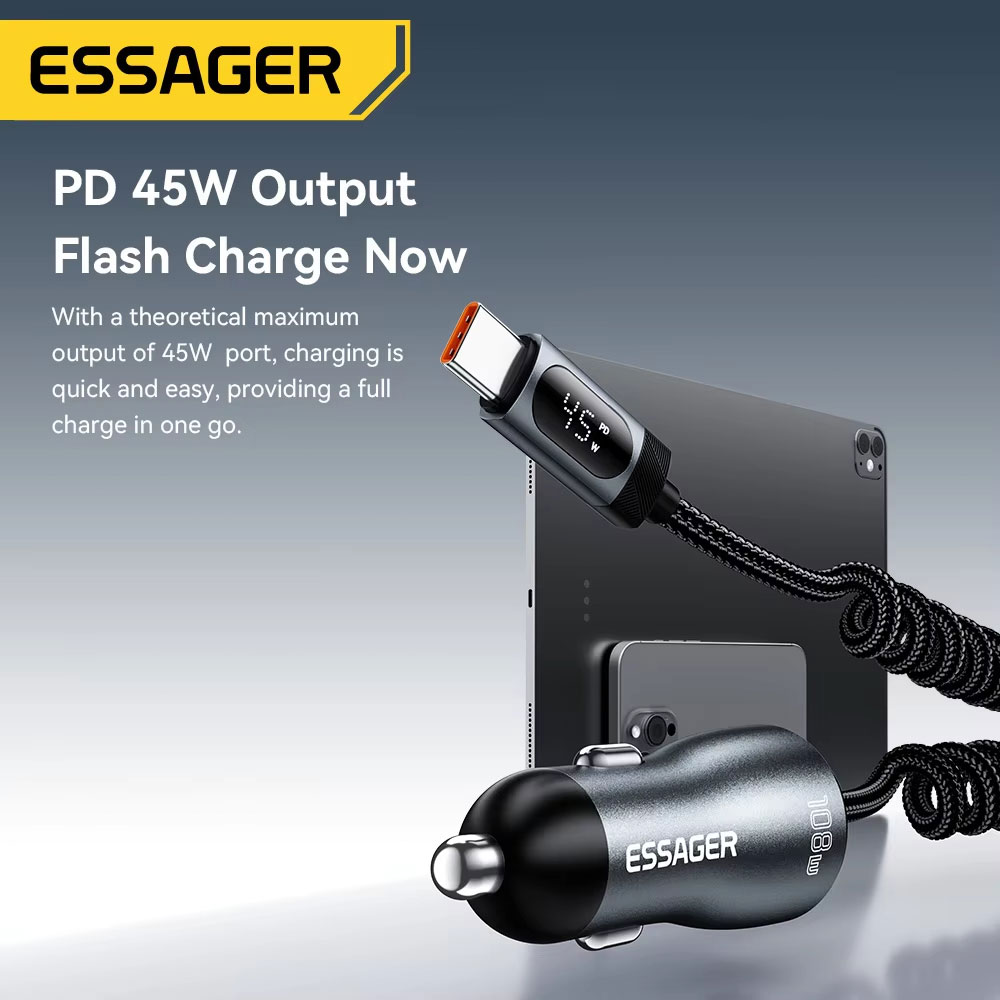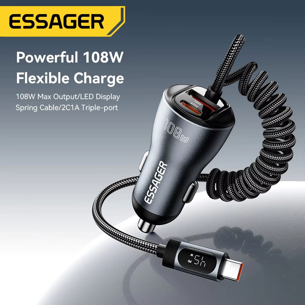 ESSAGER ES-CC29 adalah car charger fast charging 108 W 3in1 dengan material aluminum alloy yang tahan panas, dilengkapi Type-C 45 W, kabel Type-C retractable 45 W, dan USB-A 18 W untuk isi 3 perangkat sekaligus. Didukung PD 3.0 dan QC 4.0, kabel retractable 25-120 cm anti kusut, serta digital display untuk monitoring daya. Aman dengan smart chip 6 proteksi dan stabil berkat metal shrapnel anti longgar, kompatibel untuk berbagai smartphone dan kendaraan 12 V-24 V.