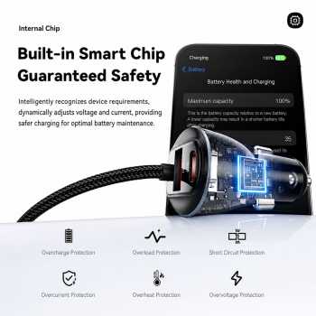 | Smart Chip Protection Dilengkapi smart chip dengan 6 sistem proteksi yang melindungi dari overcharge, overheat, hingga short circuit. Chip ini secara otomatis menyesuaikan daya sesuai kebutuhan perangkat. Mendukung berbagai protokol fast charging seperti PD 3.0 dan QC 4.0 yang kompatibel luas. Ini membuat charger mobil type c ini aman untuk berbagai brand seperti iPhone, Samsung, dan Xiaomi. |