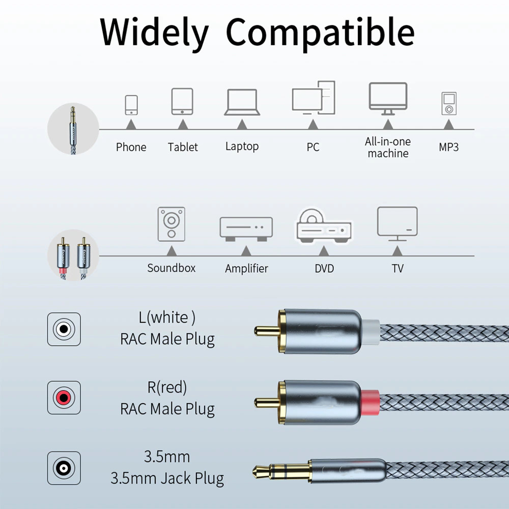 Kabel ini berfungsi untuk mengkonversi Audio dari 3.5 mm ke RCA. Dengan kabel audio ini Anda dapat menggunakan kembali speaker lama Anda yang masih menggunakan kabel RCA dengan perangkat terkini seperti smartphone, laptop, PC dan tablet yang memiliki port 3.5 mm.