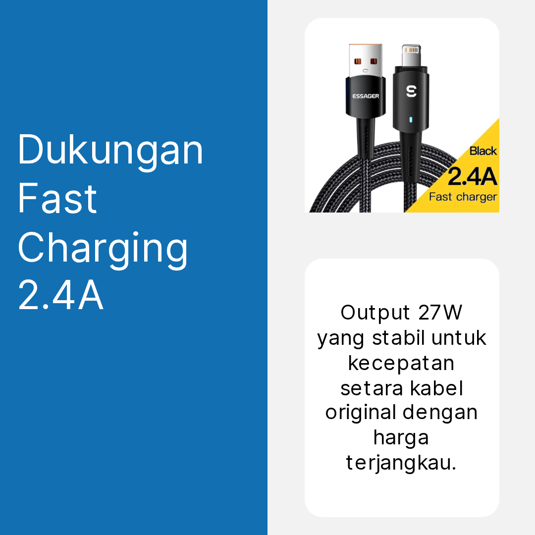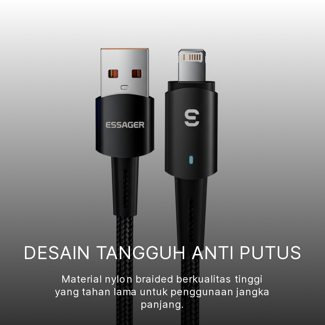 ESSAGER kabel data lightning ES-X16 adalah solusi charging dan transfer data premium untuk pengguna perangkat Apple. Dengan dukungan fast charging 27 W dan arus 2.4 A, kabel ini mampu mengisi daya iPhone, iPad, dan AirPods dengan cepat dan efisien. Dilengkapi lampu LED indicator, material nylon braided anti putus, dan chip pintar untuk keamanan perangkat, ESSAGER kabel data ES-X16 cocok untuk kebutuhan harian, traveling, kerja, atau gaming. Praktis, tahan lama, dan siap menemani aktivitas digital Anda.