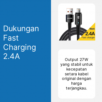 | Fast Charging 27 W, Isi Ulang Daya iPhone Lebih Cepat Kembali beraktivitas tanpa menunggu lama berkat dukungan teknologi fast charging hingga 27 W dengan arus 2.4 A. Kabel data lightning ini mampu mengisi daya iPhone, iPad, dan AirPods compatible dengan kecepatan lebih tinggi dibandingkan kabel standar. Cukup colokkan kabel ini ke adaptor yang mendukung, dan biarkan efisiensi kerjanya mengembalikan daya perangkat Apple Anda dengan cepat, solusi tepat untuk Anda yang aktif dan produktif. |