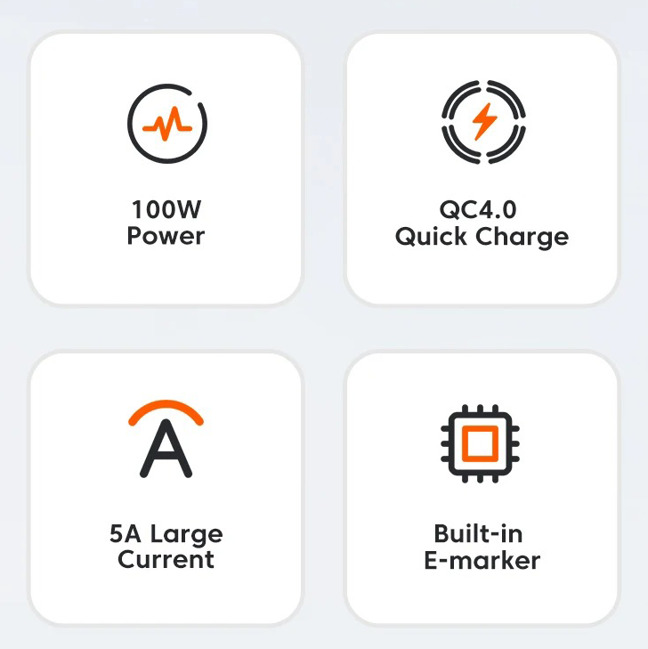 | Suplai Daya Tinggi dan Efisien Besaran daya yang dihantarkan membuat proses pengisian daya makin gesit. Kabel data ini mampu menyuplai daya hingga 100 W. Tak ketinggalan teknologi fast charging QC 4.0 yang membuat durasi pengisian daya jadi makin singkat. Perangkat Anda dapat terisi hingga penuh hanya dalam waktu 2 jam saja. |