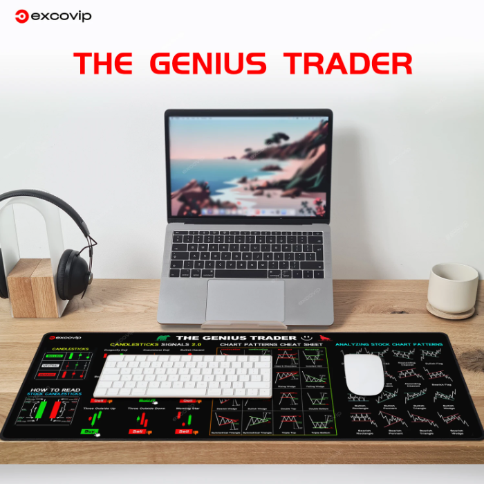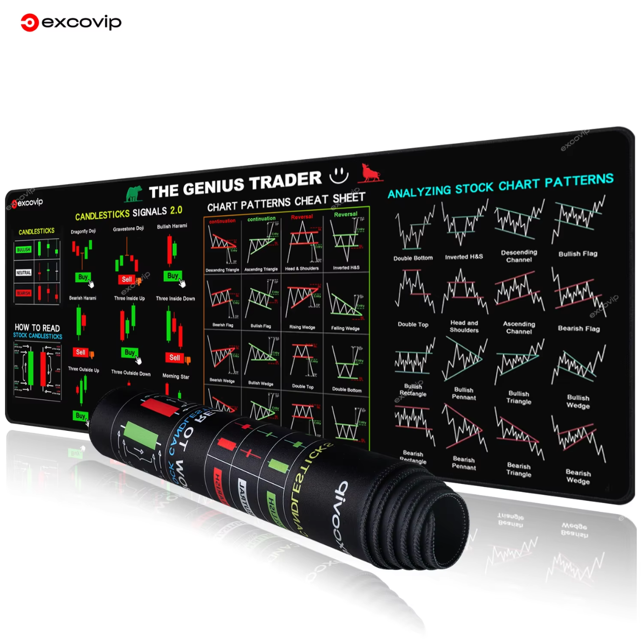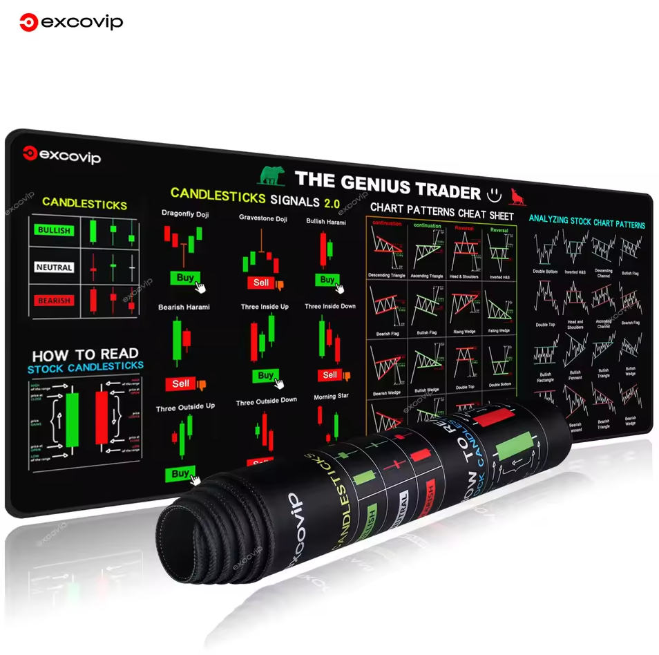 Tunjang aktivitas di depan monitor dengan EXCOVIP Mouse Pad Deskmat berkualitas. Mouse pad ini tidak hanya berfungsi sebagai alas mouse dan keyboard, tetapi juga menampilkan berbagai chart pattern dan candlestick cheat sheet yang membantu Anda menganalisis pergerakan market dengan lebih cepat. Cocok digunakan untuk trader saham, crypto, maupun forex yang ingin tetap fokus dan efisien di depan monitor.