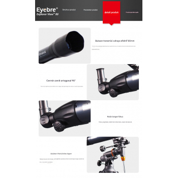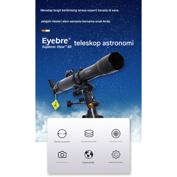 Teleskop Eyebre 900/80mm hadir dengan lensa objektif besar dan cermin zenit untuk kenyamanan observasi. Dudukan EQ Mount memudahkan mengikuti pergerakan bintang, menghasilkan pandangan jernih dan detail. Cocok bagi pemula maupun pecinta astronomi yang ingin menjelajahi bulan, planet, dan langit malam.