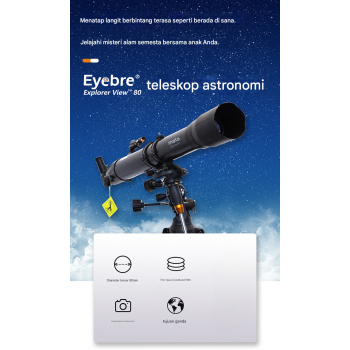 Teleskop Eyebre 900/80mm hadir dengan lensa objektif besar dan cermin zenith untuk kenyamanan observasi. Dudukan EQ mount memudahkan mengikuti pergerakan bintang, menghasilkan pandangan jernih dan detail. Cocok bagi pemula maupun pecinta astronomi yang ingin menjelajahi bulan, planet, dan langit malam.