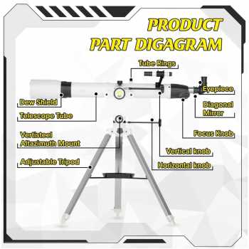 | Tripod Adjustable dengan Sistem AZ yang Stabil Teleskop ini dilengkapi tripod adjustable dengan tinggi 70 hingga 135 cm yang dapat disesuaikan dengan postur pengguna. Sistem mounting AZ memudahkan pergerakan horizontal dan vertikal, membuat proses pelacakan objek langit menjadi lebih stabil, presisi, dan mudah dikontrol. |