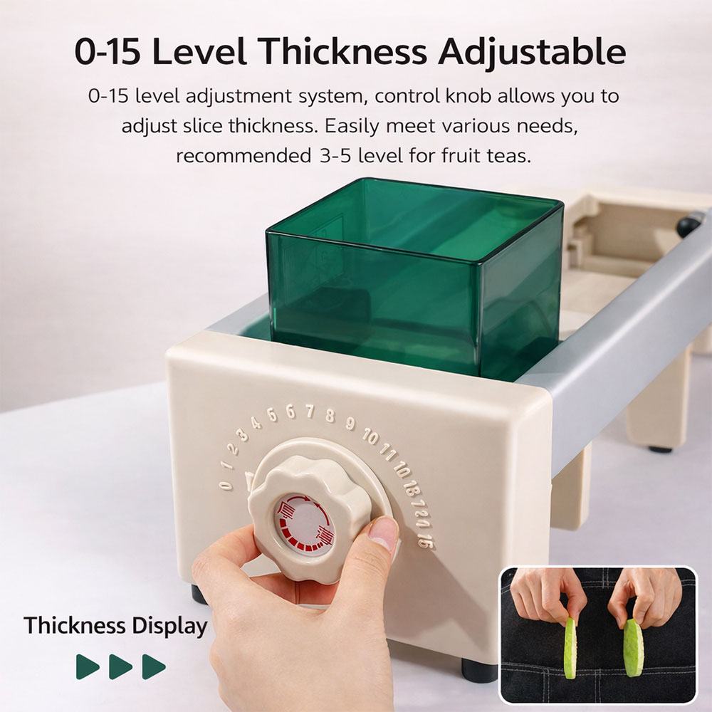 | 15 Tingkat Ketebalan Dilengkapi knob dengan 15 tingkat ketebalan yang bisa disesuaikan, Anda bisa mengatur hasil irisan sesuai kebutuhan, mulai dari super tipis hingga lebih tebal. Fitur ini sangat penting untuk usaha minuman seperti fruit tea yang membutuhkan tampilan buah tipis dan estetik. Dengan kontrol presisi ini, hasil potongan jadi lebih konsisten dan profesional. Tidak perlu lagi memotong manual yang hasilnya berbeda-beda. |