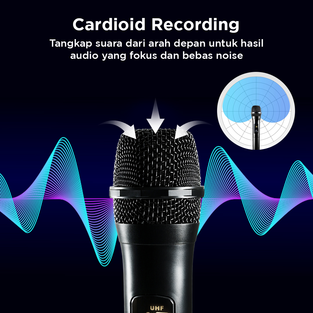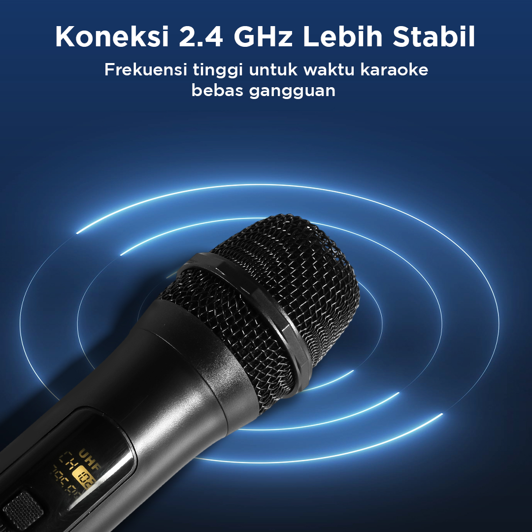 | Koneksi UHF Lebih Stabil Koneksi UHF menggunakan sinyal dengan frekuensi 30 Hz - 20 KHz yang lebih stabil dan tidak mudah terganggu oleh sinyal wireless lainnya. Kini Anda bisa bernyanyi dengan nyaman tanpa terganggu sinyal yang lemah atau terputus. |