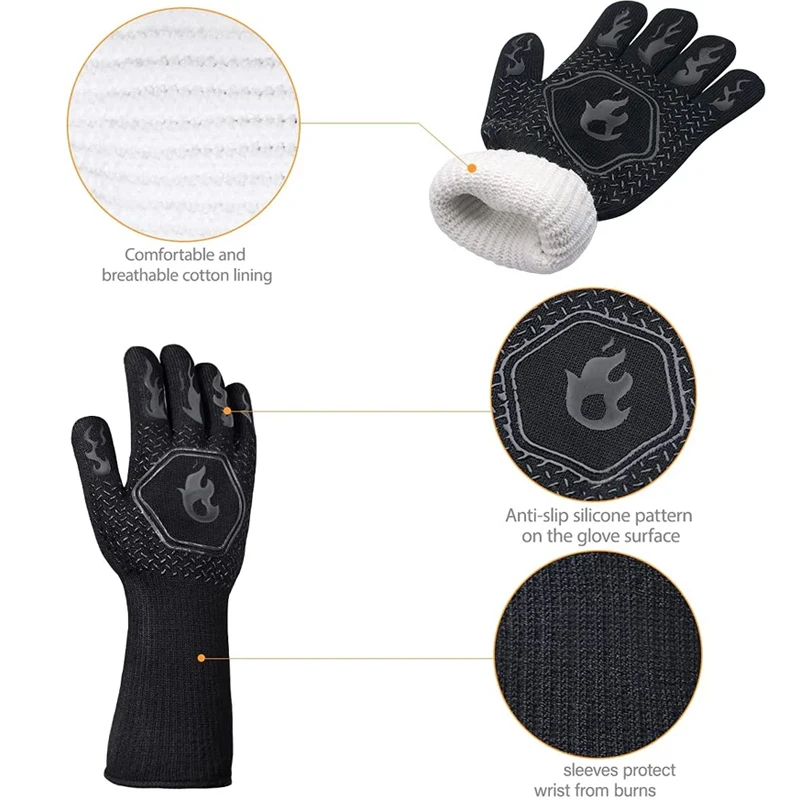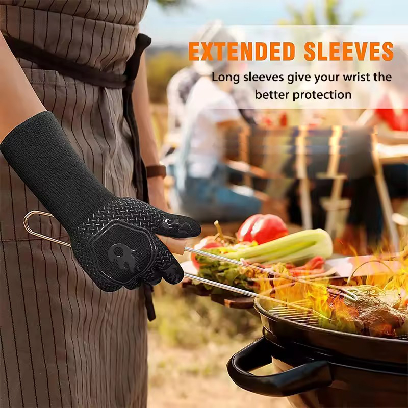 | Tahan Panas Ekstrem Lindungi tangan Anda dari suhu tinggi hingga 800 °C saat memasak, memanggang, atau BBQ tanpa rasa khawatir. Cocok digunakan oleh chef rumahan maupun profesional, sarung tangan ini memberikan perlindungan optimal saat memegang loyang panas, panggangan menyala, atau alat masak bersuhu tinggi, sehingga risiko tangan terbakar dapat diminimalkan secara signifikan. |
