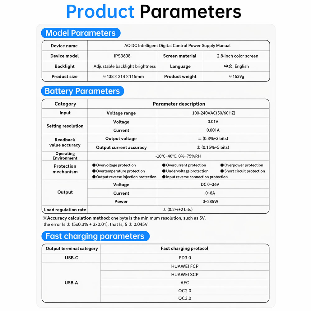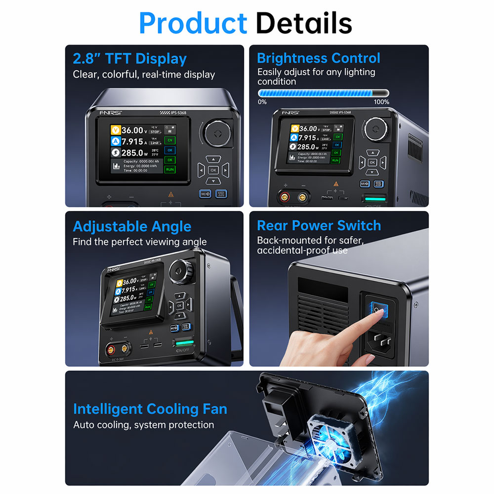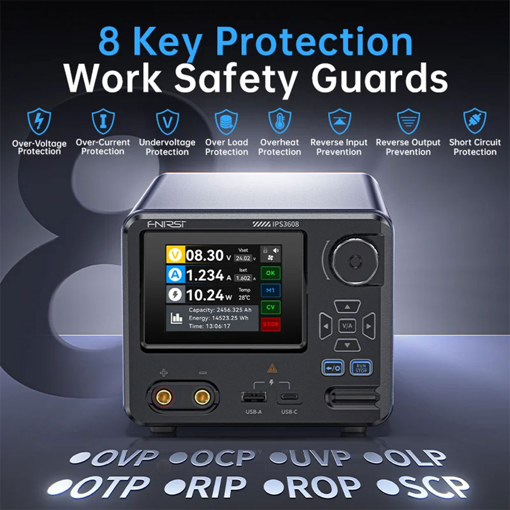 FNIRSI IPS3608 power supply DC CNC generasi terbaru yang mengkonversi AC 100-240 V menjadi DC stabil 0-36 V / 0-8 A / 0-285 W, dengan akurasi resolusi 0,01 V dan 0,001 A untuk kebutuhan laboratorium, bengkel servis, hingga industri manufaktur. Dilengkapi layar warna 2,8 inci dan 8 lapisan proteksi otomatis, power supply ini menjamin keamanan beban sekaligus kemudahan pengoperasian harian.