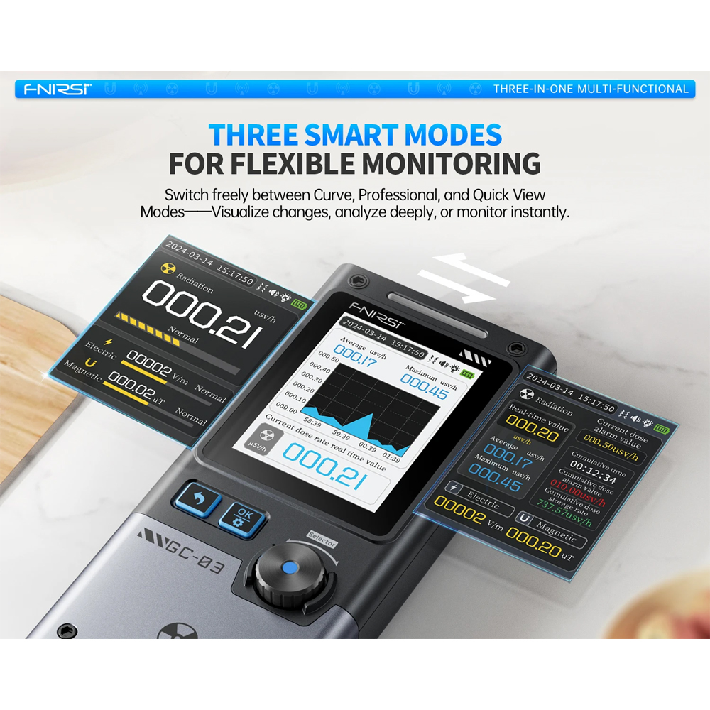 | Alat Deteksi Multifungsi Geiger counter FNIRSI mampu mendeteksi radiasi nuklir, medan listrik (EF), dan medan magnet (MF) dalam satu perangkat ringkas. Kombinasi ini memungkinkan Anda memantau potensi bahaya dari berbagai sumber radiasi, baik di lingkungan kerja, rumah, maupun area publik, tanpa perlu menggunakan beberapa alat terpisah. |