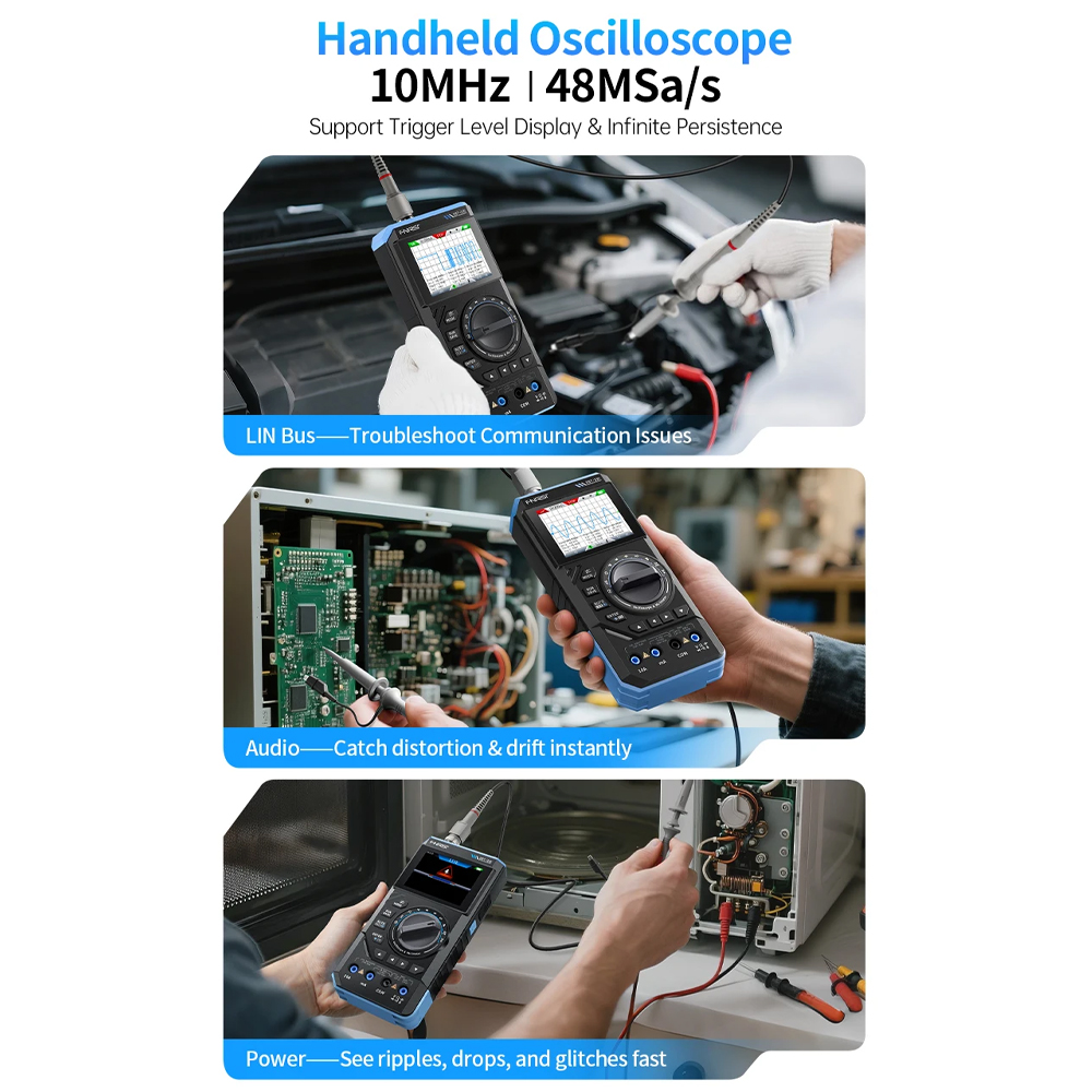 Jika ingin memiliki alat multifungsi yang dapat diandalkan untuk menganalisis sinyal elektronik, menguji transistor, dan menghasilkan sinyal, Anda harus memiliki Digital Oscilloscope dari FNIRSI. Menggabungkan 3 fungsi dalam satu alat yang praktis digunakan, dengan tingkat akurasi tinggi sehingga hasilnya presisi. Hasil pengujian ditampilkan pada layar digital berwarna dengan kualitas HD.