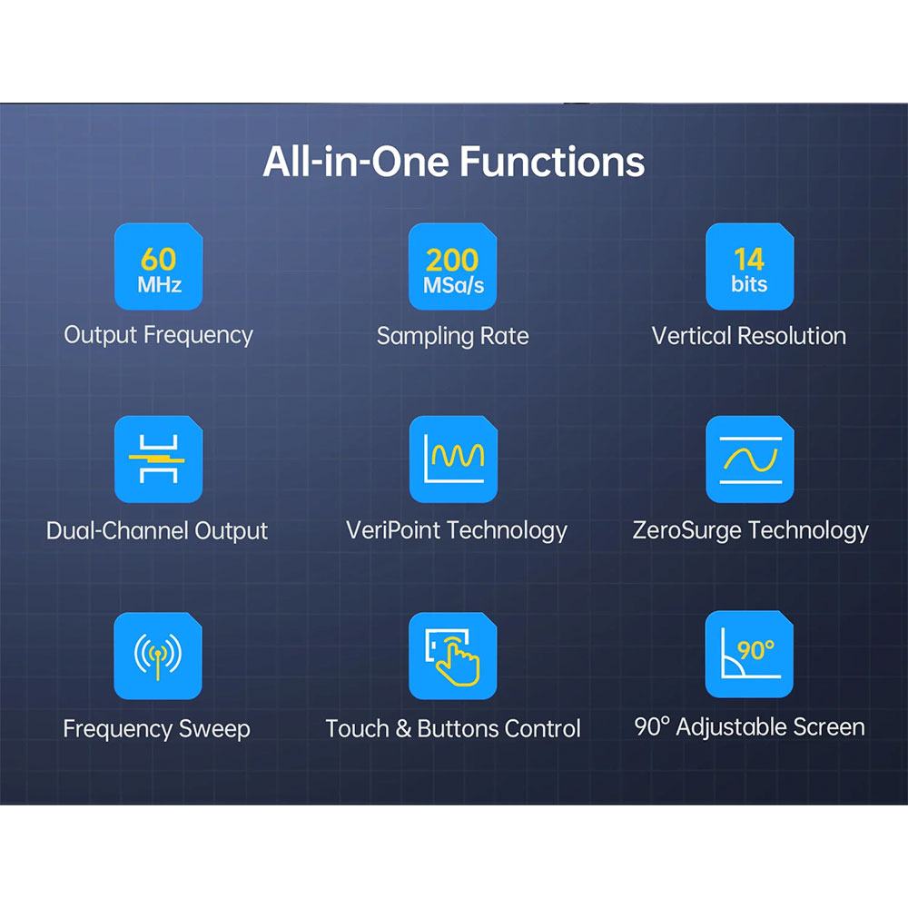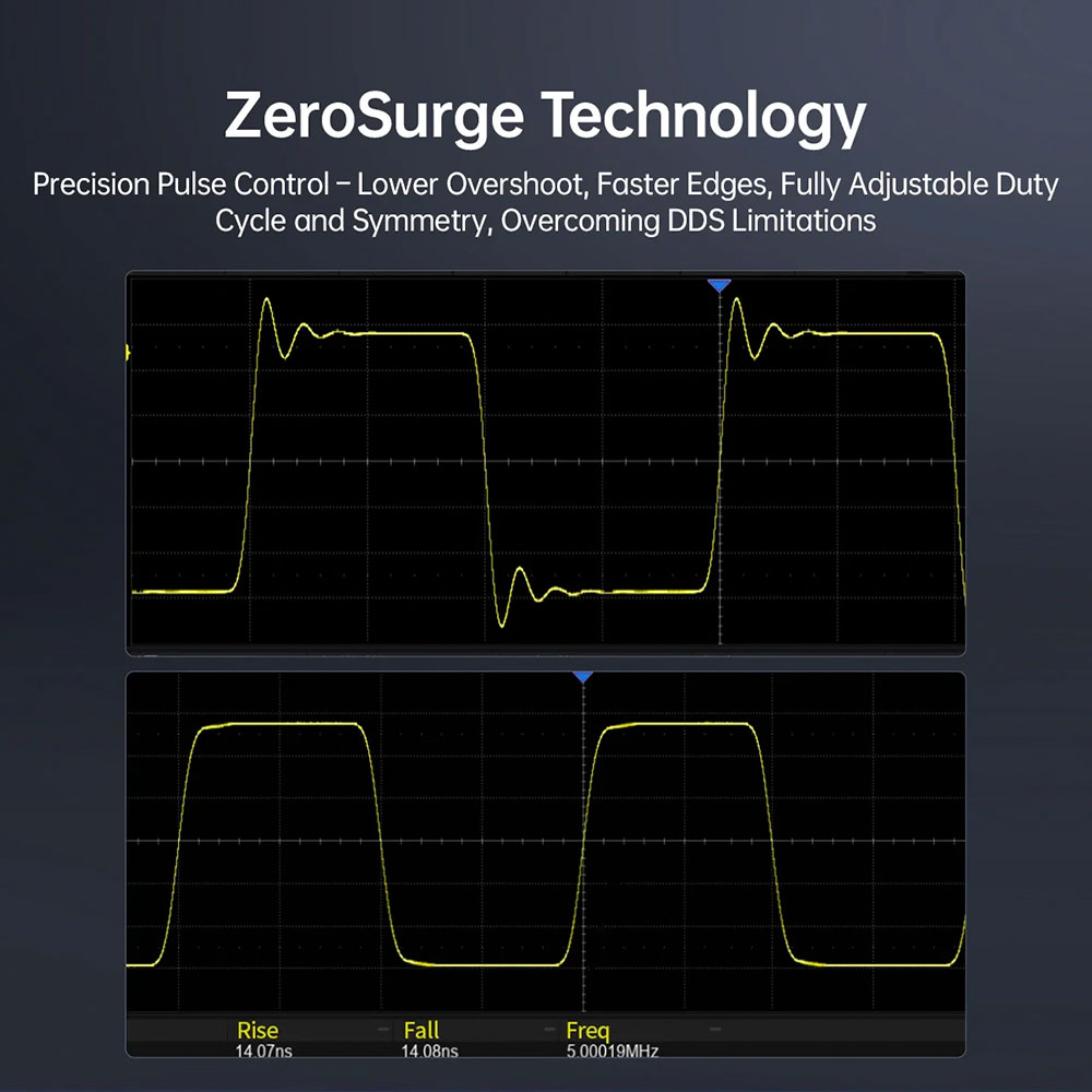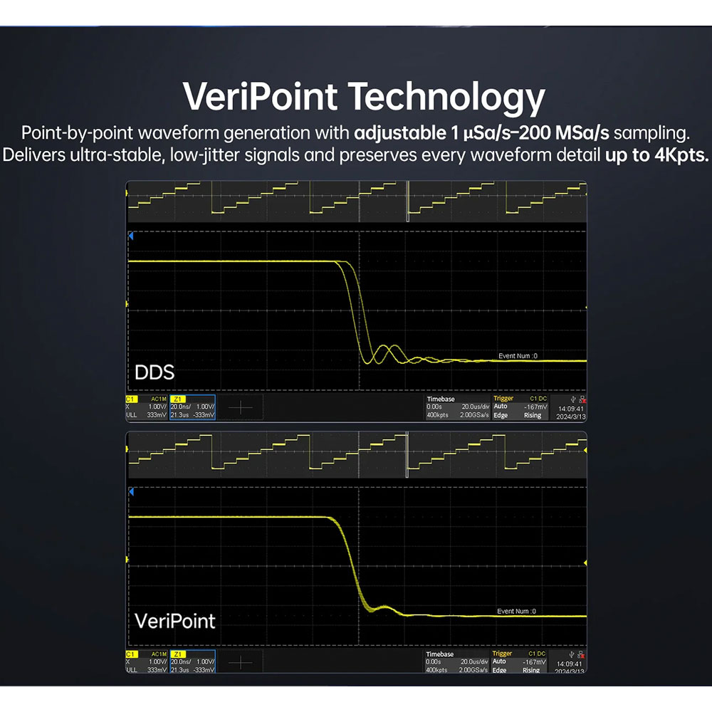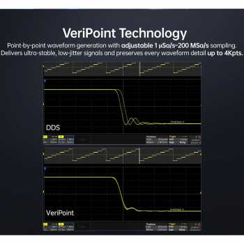 | Teknologi DDS 200 MSa/s dan Resolusi 14 bit Teknologi Direct Digital Synthesis (DDS) memberikan sinyal yang sangat stabil dan akurat. Dengan sampling rate tinggi 200 MSa/s, waveform yang dihasilkan menjadi halus dan minim distorsi. Resolusi 14-bit memastikan detail sinyal tetap terjaga bahkan pada frekuensi tinggi. |