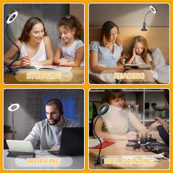 Lampu meja LED jepit dengan desain ring light modern dan fleksibel 360° ini dirancang untuk mendukung aktivitas belajar, kerja, membaca, hingga video conference. Menggunakan 48 LED premium dengan 30 kombinasi cahaya, lampu ini memberikan pencahayaan stabil tanpa flicker dan tanpa silau. Cukup colok ke USB dan langsung siap digunakan di mana saja.