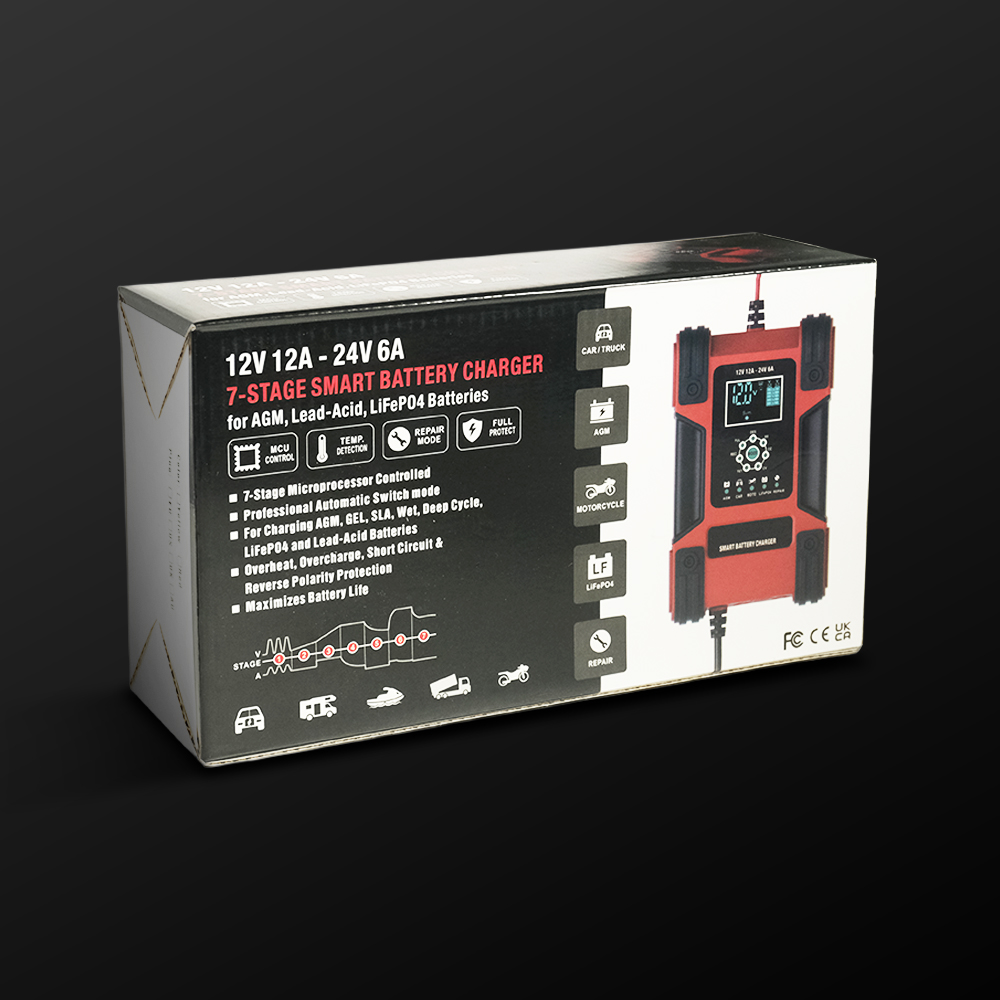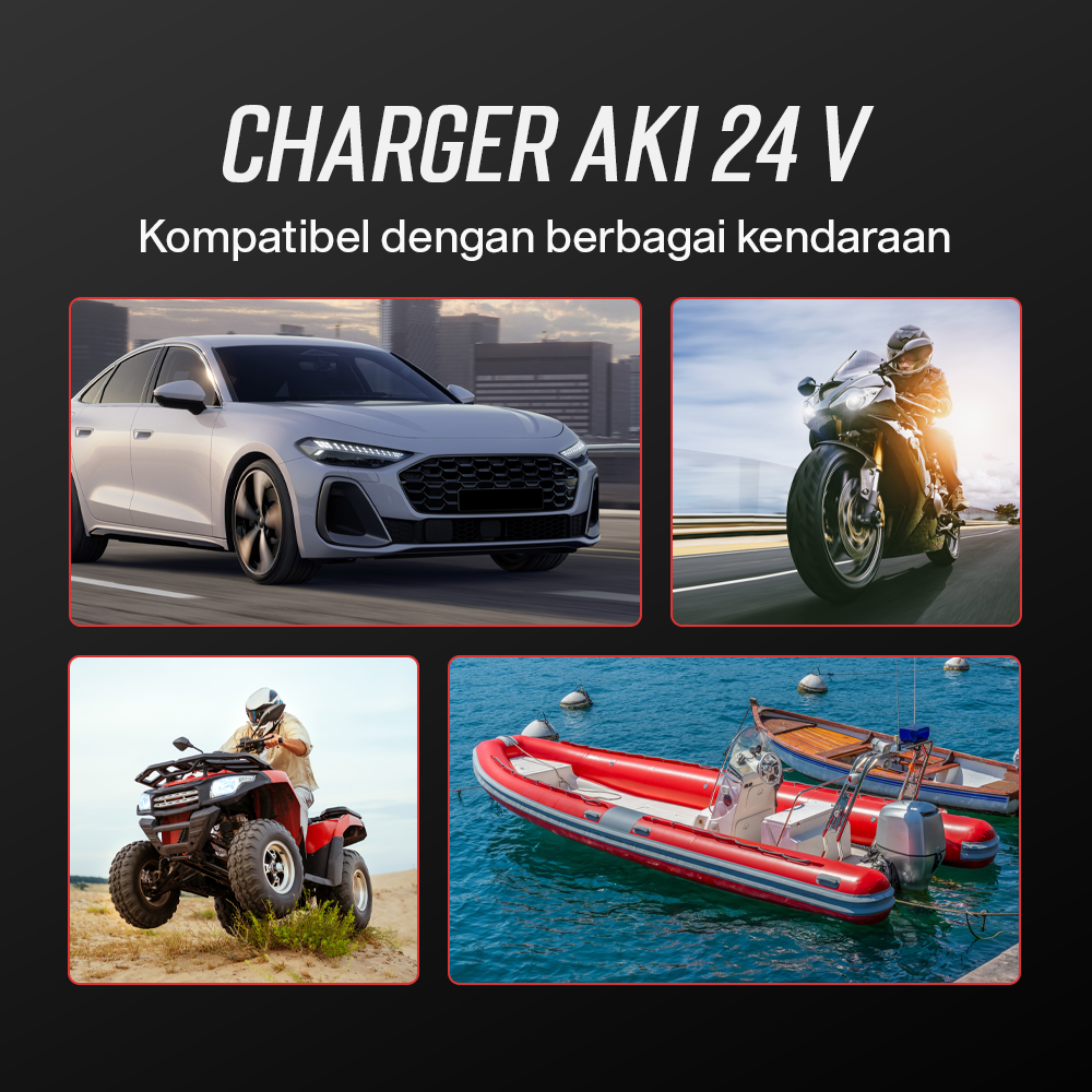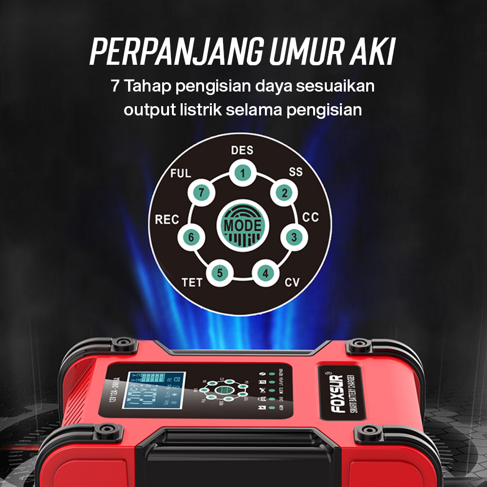 | Perpanjang Umur Aki 7 Tahap pengisian sesuaikan output arus listrik selama pengisian untuk cegah kerusakan pada kendaraan. Efektif cegah overheat dan perpanjang umur aki. |