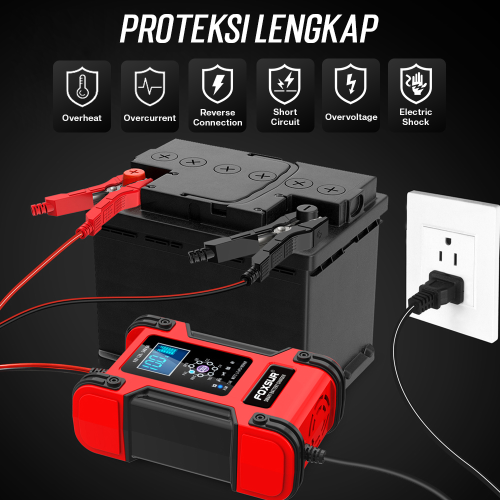 | Aman dengan Proteksi Lengkap Fitur intelligent charger juga membuat charger aki ini dilengkapi proteksi lengkap. Mulai dari proteksi arus pendek hingga pengisian daya berlebih, kini Anda dapat mengisi daya aki kendaraan dengan aman. |