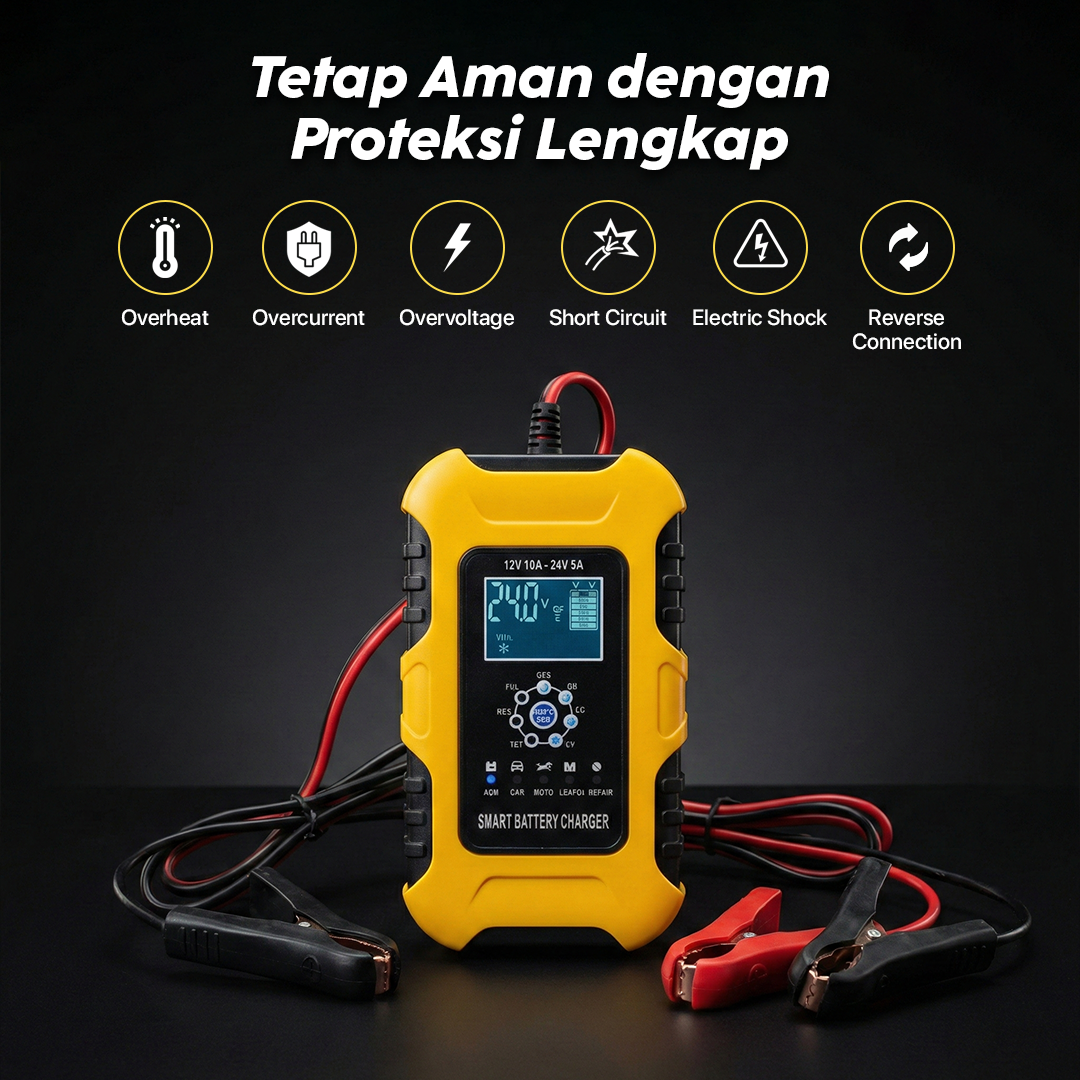 | Aman dengan Proteksi Lengkap Fitur intelligent charger juga membuat charger aki ini dilengkapi proteksi lengkap. Mulai dari proteksi arus pendek hingga pengisian daya berlebih, kini Anda dapat mengisi daya aki kendaraan dengan aman. |
