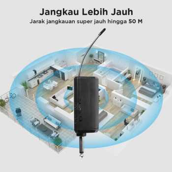 | Jangkau Lebih Jauh Receiver eksternal dapat menjangkau seluruh ruangan dengan jarak super jauh hingga 50 M. Cocok digunakan untuk memeriahkan acara di ruangan kecil hingga besar. |