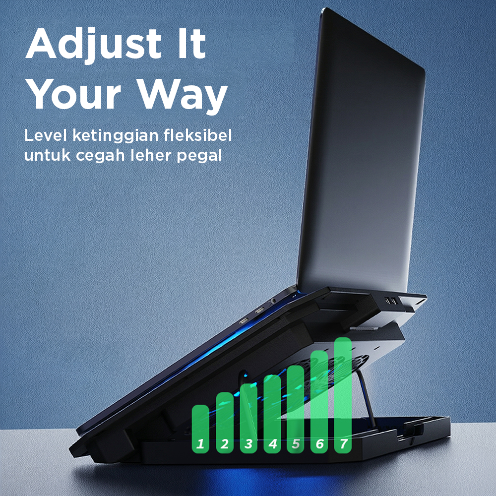Performa laptop menurun karena overheat? Cooling pad laptop dari GIVECOOL hadir dengan 2 kipas berkecepatan tinggi dan senyap jaga suhu laptop tetap stabil bahkan dengan beban kerja berat. 7 Level ketinggian dapat diatur sesuai kebutuhan agar nyaman digunakan. Kini Anda bisa memainkan berbagai game dengan tenang tanpa khawatir rusak karena overheat.