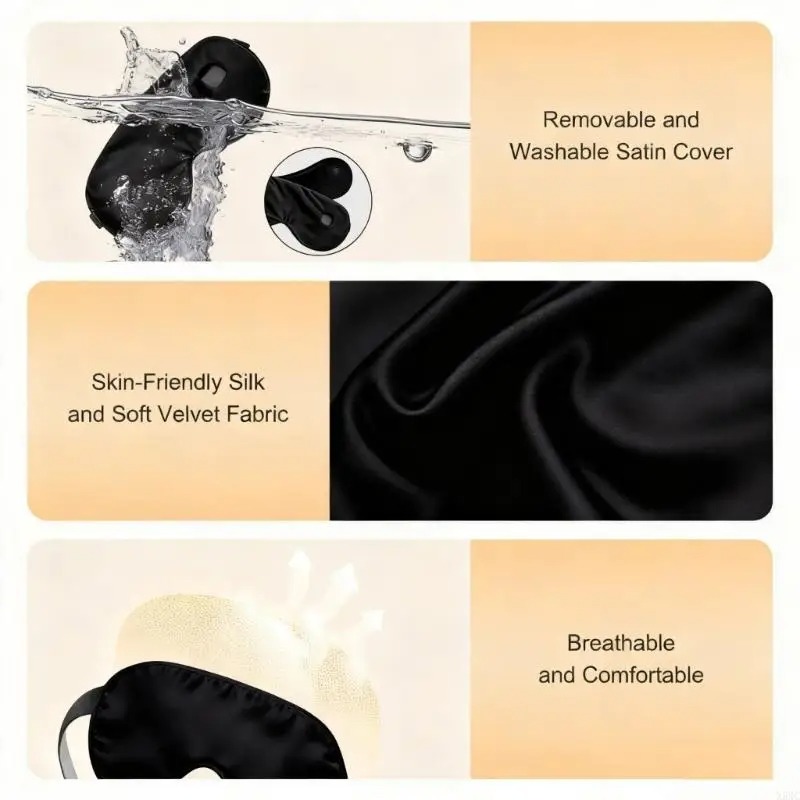 | Bahan Lembut, Nyaman di Kulit Terbuat dari silk fabric berkualitas, penutup mata terasa halus, adem, dan tidak menimbulkan iritasi pada kulit sensitif. Teksturnya lembut mengikuti kontur wajah, memberikan kenyamanan maksimal bahkan saat digunakan dalam waktu lama atau saat tidur malam. |