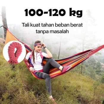 | Bersantai Berdua Lebih Seru Hammock ini cukup luas untuk digunakan oleh dua orang sekaligus. Cocok untuk bersantai bersama pasangan, teman, atau keluarga saat camping di alam terbuka. Nikmati momen kebersamaan tanpa khawatir sempit berkat ukuran hammock yang lega. |