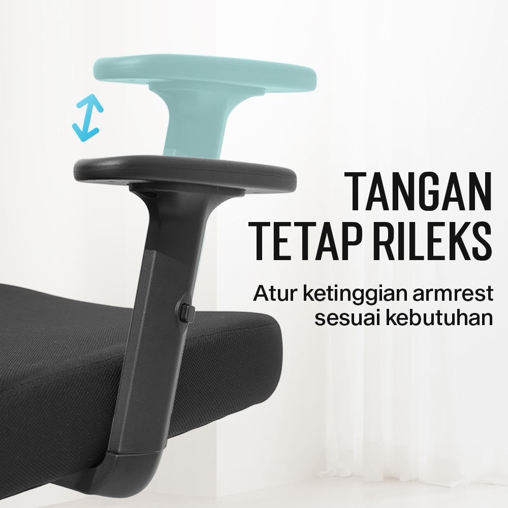 | Tangan Tetap Rileks Bagian samping dilengkapi armrest yang dapat diatur ketinggiannya. Atur sesuai tinggi sesuai kebutuhan untuk mengistirahatkan dan memastikan tangan tetap rileks saat bekerja. |