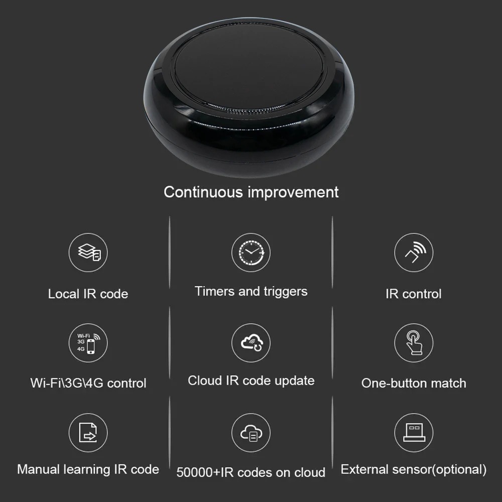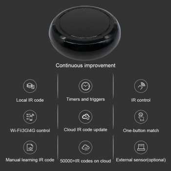 | Kompatibilitas Luas Smart universal IR remote control ini kompatibel dengan berbagai perangkat seperti TV, AC, set-top box, kipas angin, proyektor, lampu, dan perangkat lainnya yang mendukung kontrol IR. Tidak perlu lagi menumpuk remote control yang berbeda di meja Anda semua bisa diintegrasikan dalam satu perangkat pintar. Mendukung lebih dari 4000 merek perangkat elektronik dan 5000 kode IR di cloud. Hanya mendukung remot yang menggunakan IR, tidak kompatibel dengan remot bluetooth dan RF. |
