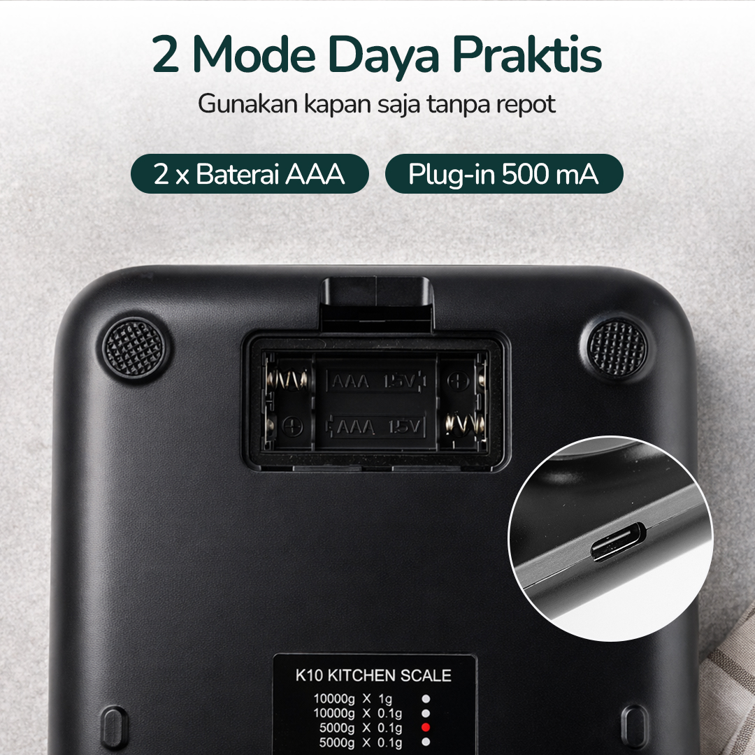 | Praktis dengan 2 Mode Daya Menggunakan timbangan dapur kapan saja bukan masalah berkat 2 mode daya yang ditawarkan. Gunakan baterai untuk waktu penggunaan lebih panjang atau adaptor plug-in untuk mengisi daya saat darurat. |