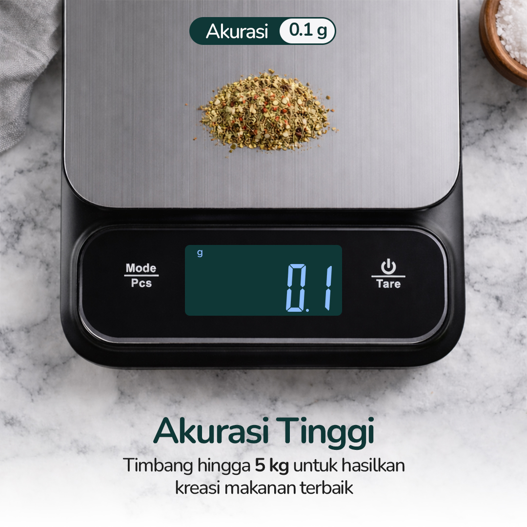 | Akurasi Tinggi Berat bahan makanan dijamin pas dengan tingkat akurasi tinggi 1 g. Timbang aneka bahan makanan hingga berat 5 kg untuk buat aneka kue dan bahan makanan dengan rasa yang pas. |