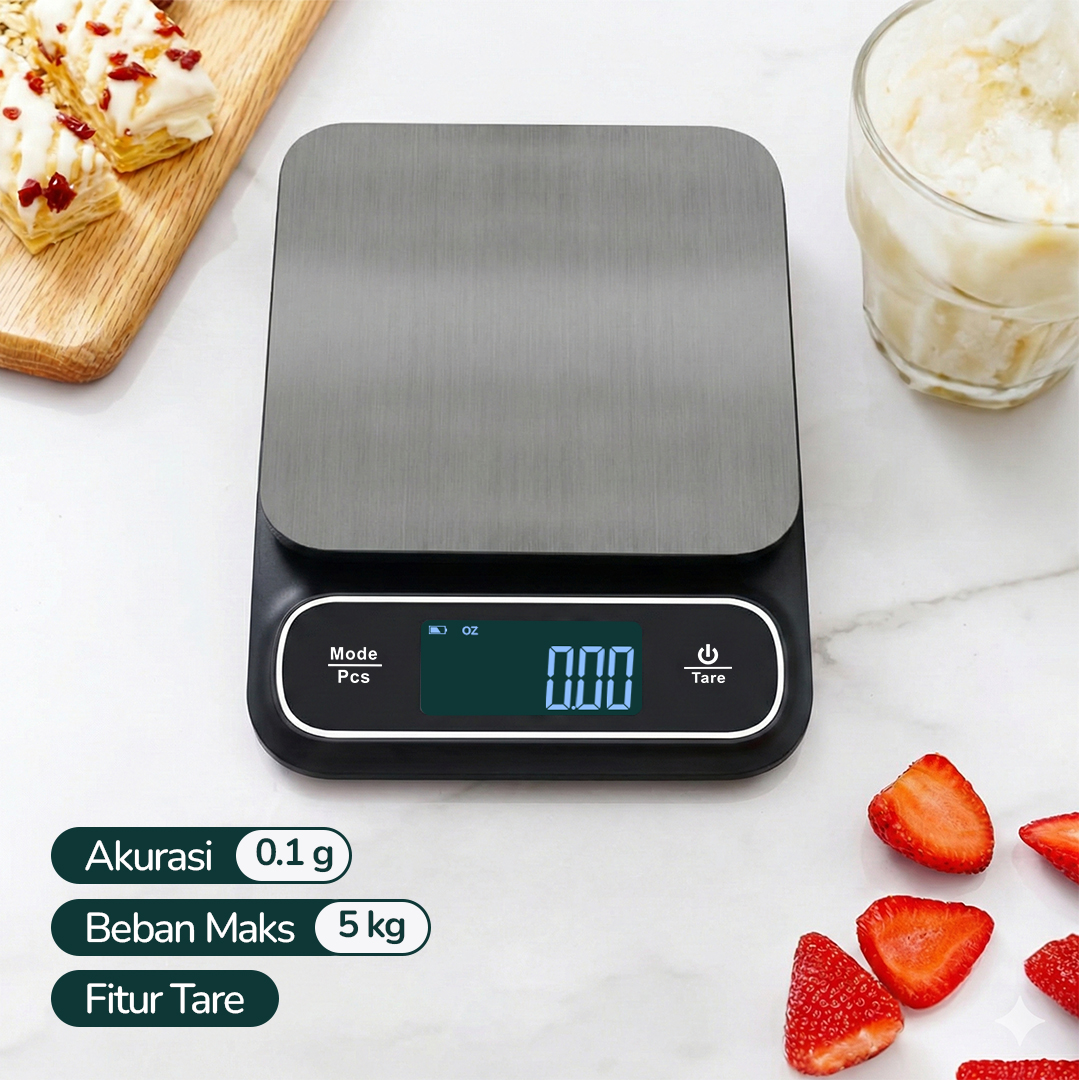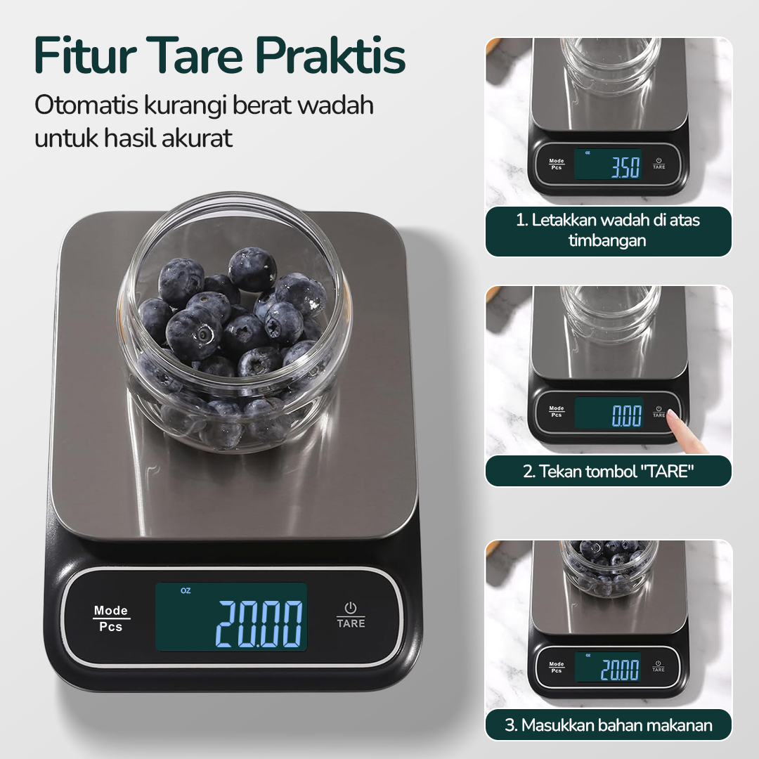 | Fitur Tare Akurat Timbangan secara otomatis mengurangi berat wadah agar hasil pengukuran lebih akurat. Cocok untuk membuat hidangan yang butuh presisi tinggi. |