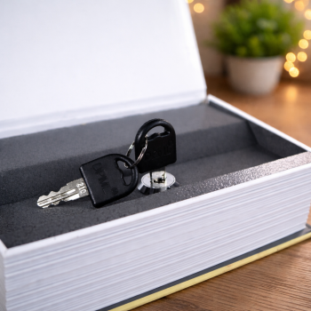 | Desain Buku Dirancang menyerupai buku tebal atau kamus, brankas ini menyatu sempurna dengan koleksi di rak Anda. Cocok untuk menyimpan dokumen, uang, kunci, paspor, hingga smartphone tanpa terlihat seperti brankas. |