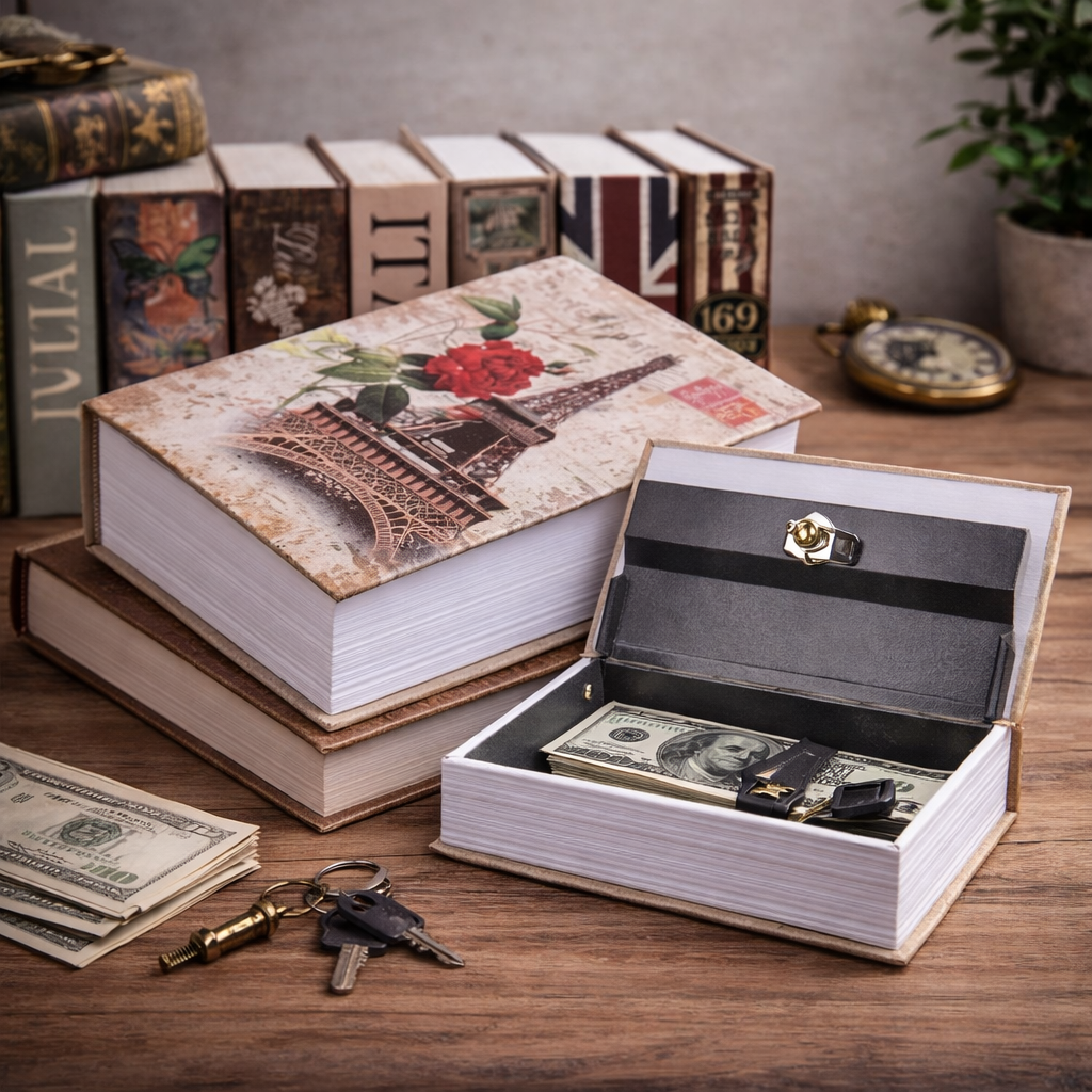 Kotak penyimpanan atau security box ini memiliki bentuk unik seperti novel sehingga orang lain akan terkelabui oleh bentuknya. Anda pun dapat menyimpan barang-barang rahasia, penting, dan berharga di dalam kotak penyimpanan buku ini. Dengan bentuk yang unik ini, maka tidak akan ada orang yang menduga bahwa buku ini adalah sebuah kotak penyimpanan barang.