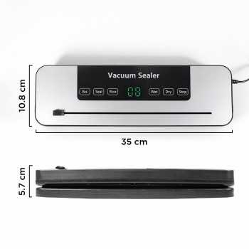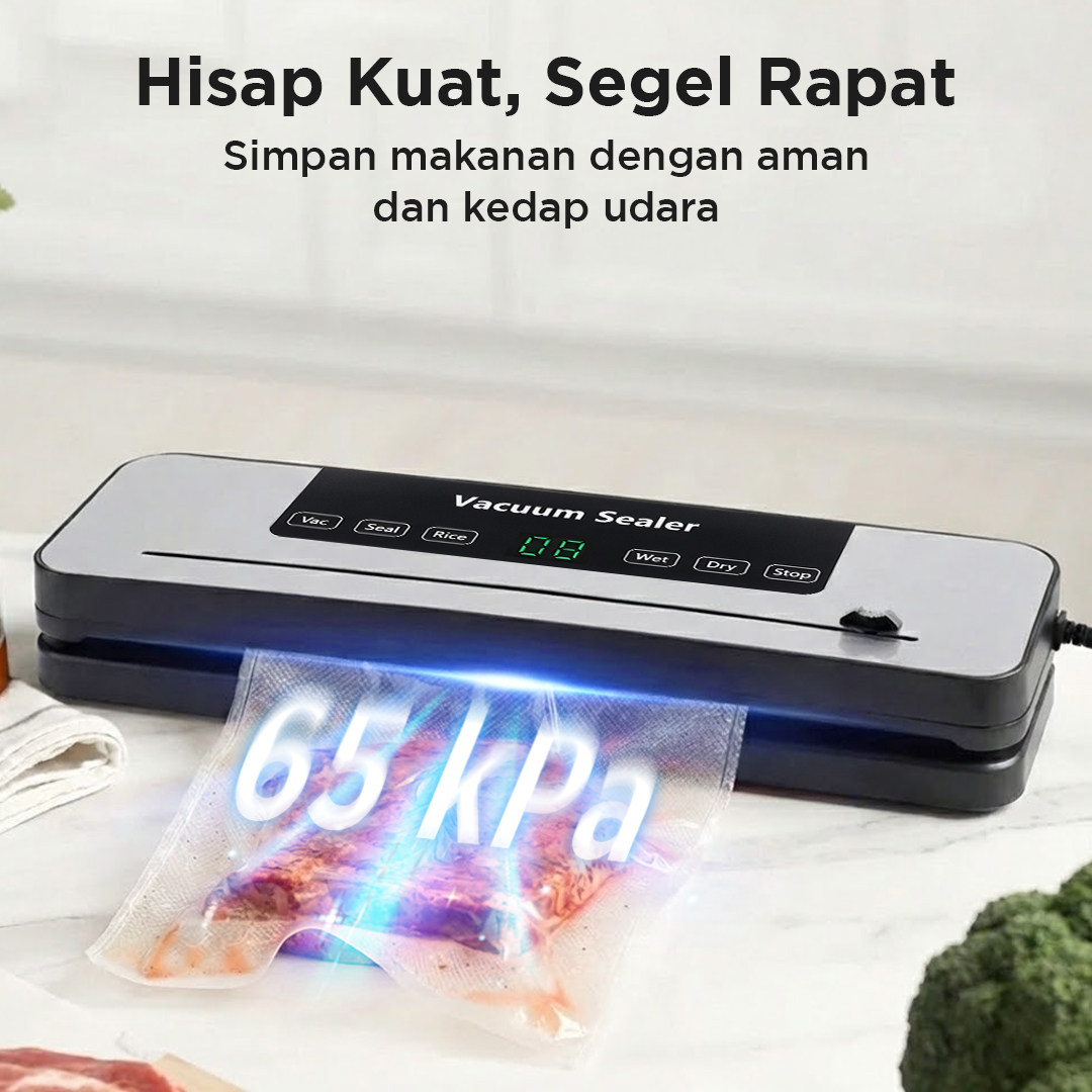 | Hisap Kuat, Segel Rapat Memiliki daya hisap hingga 65 kPa, vacuum sealer ini dapat menyedot udara di dalam kemasan dengan maksimal. Makanan pun dapat tersimpan dengan aman tanpa kharwatir risiko rusak atau kadaluwarsa. |